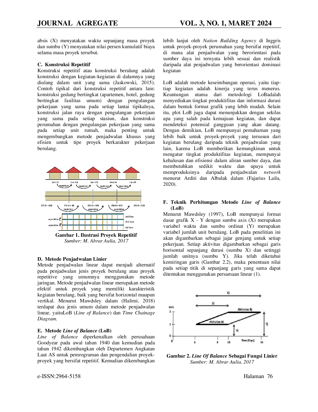 Journal AgregateJournal AgregateConstruction projects that have repetitive or repetitive work packages such as housing, school buildings, highways or manufacturing industry projects require a project scheduling method that is able to accommodate continuous and well scheduled resource requirements without the occurrence of a hitch. In the New Classroom Development Project for Madrasah Ibtidaiyah Negeri 5 Central Maluku, the author reviewed using the S – Curve scheduling method and experienced delays in implementation due to rainy weather, delays in material mobilization and lack of manpower, so the author will analyze scheduling with a special method for repetitive work, namely by using the method Line of Balance (LoB). Method Line of Balance (LoB) is a project scheduling method that can provide productivity levels and duration information in graphical format and can show activity progress, and can detect potential disturbances or conflicts in work items to be worked on. From the results of research on the New Classroom Construction Project for Madrasah Ibtidaiyah Negeri 5 Central Maluku, there are conflicts in several work items, including: Structural work on the second floor intersecting with wall and plastering work on the first floor, Wall and plastering work on the second floor intersecting with ceiling work on the second floor, Sanitary works on the first floor intersect with Aluminum Composite Panel (ACP) works on the first floor. The calculation results also show that the final duration of project scheduling is 84 days or 12 weeks, therefore the LoB method is effective in its use because it is able to detect conflicts in the S-Curve from the LoB graphic depiction.