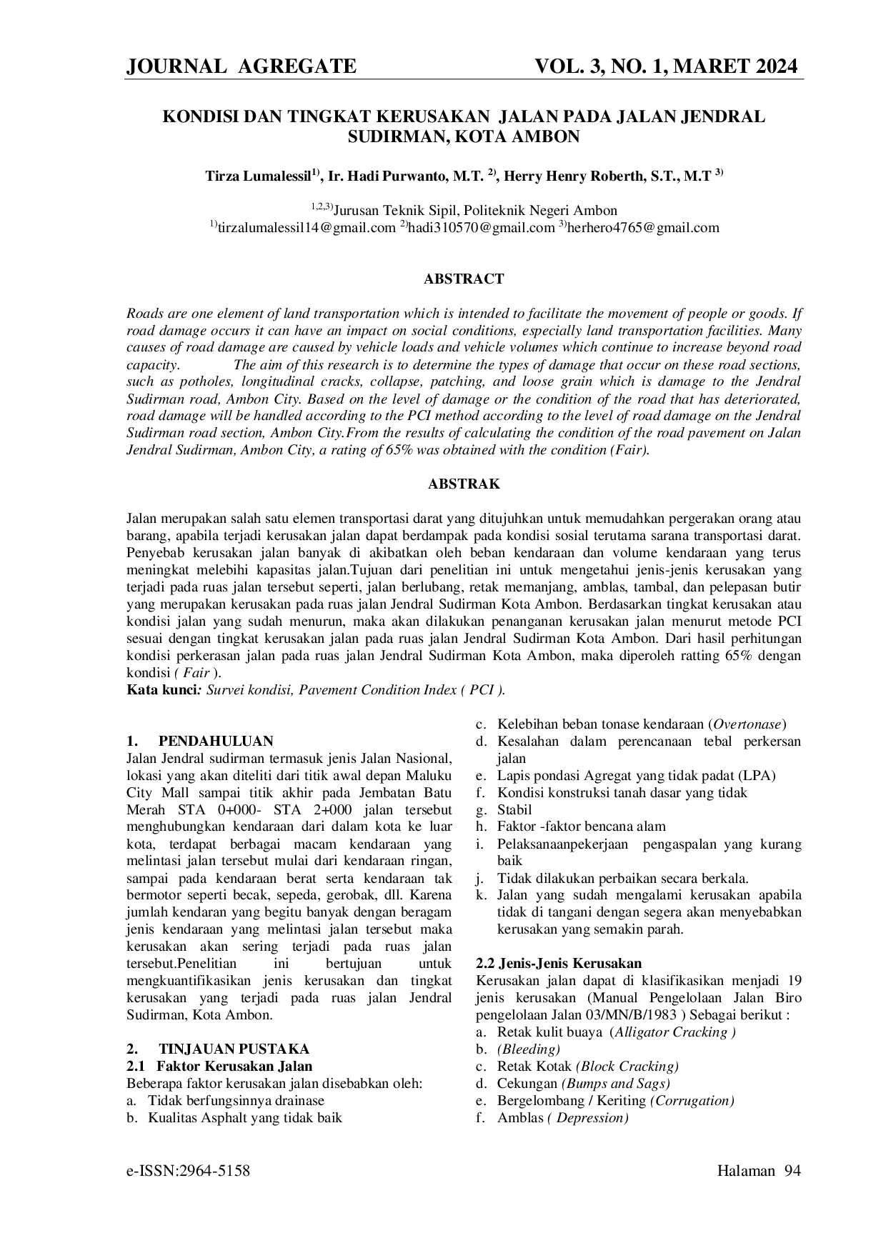 Hasil survei kondisi kerusakan jalan menunjukkan jenis-jenis kerusakan yang terjadi pada ruas jalan Jendral Sudirman Kota Ambon meliputi lubang (potholes), pelepasan butir (weathering), retak memanjang atau melintang (transverse cracking), dan tambal (patching).Dengan analisis tingkat kerusakan jalan menggunakan metode PCI, diperoleh hasil tingkat kerusakan jalan pada ruas jalan tersebut senilai 65% dengan ratting Fair di ruas jalan Jendral Sudirman.