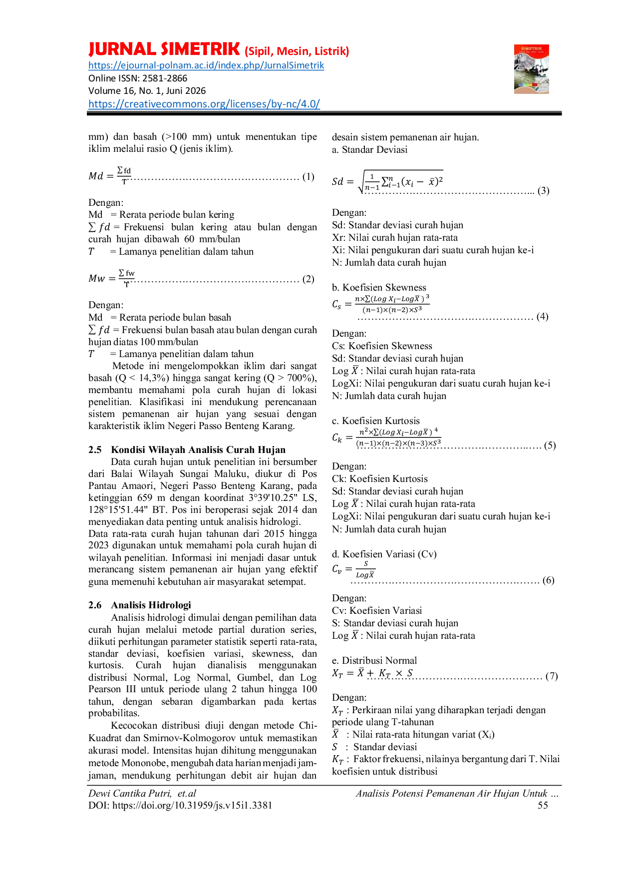JURNAL SIMETRIKJURNAL SIMETRIKNegeri Passo Benteng Karang, sebuah dusun di Kecamatan Baguala, terletak di daerah perbukitan dengan tanah berbatu, sehingga akses terhadap sumber air tanah menjadi sulit. Meskipun memiliki satu sumur bor dan satu reservoir, masyarakat setempat sering mengalami kekurangan air bersih karena pasokan yang tersedia tidak mencukupi kebutuhan harian. Untuk mengatasi permasalahan ini, diusulkan solusi yang efisien dan hemat biaya, yaitu sistem pemanenan air hujan melalui atap (rooftop rainwater harvesting/RWH). Penelitian ini menganalisis iklim, curah hujan menggunakan metode Gumbel, kebutuhan air masyarakat, debit rencana menggunakan metode rasional, serta potensi pemanenan air hujan. Hasil penelitian menunjukkan volume air hujan maksimum yang dapat dipanen sebesar 4.133,5 m³/hari saat curah hujan melebihi 100 mm, sementara kebutuhan air bersih harian hanya sebesar 144 m³/hari. Dengan demikian, kebutuhan air bersih di Negeri Passo Benteng Karang dapat terpenuhi sepenuhnya melalui penerapan metode RWH.
