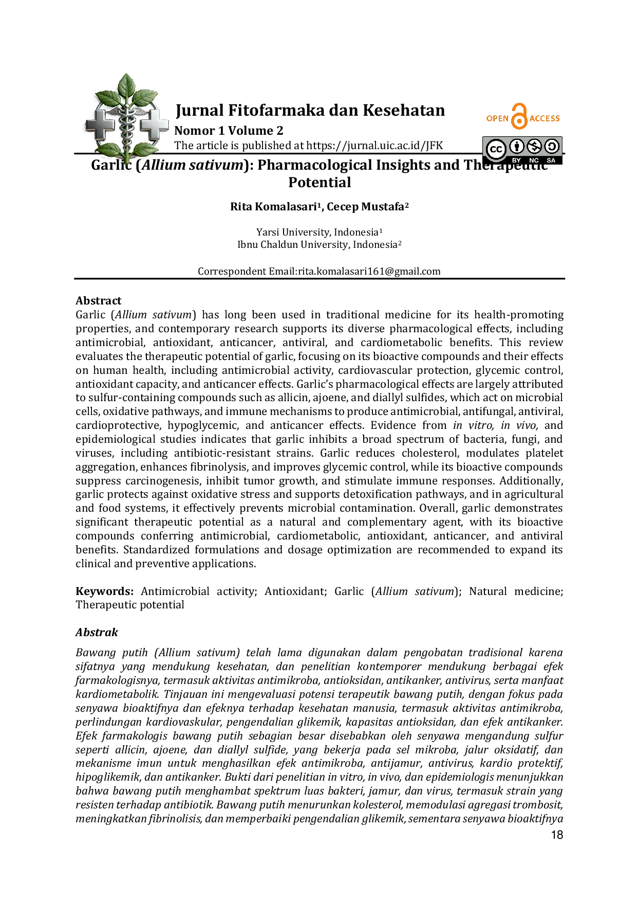 Jurnal Fitofarmaka Dan KesehatanJurnal Fitofarmaka Dan KesehatanBawang putih (Allium sativum) telah lama digunakan dalam pengobatan tradisional karena sifatnya yang mendukung kesehatan, dan penelitian kontemporer mendukung berbagai efek farmakologisnya, termasuk aktivitas antimikroba, antioksidan, antikanker, antivirus, serta manfaat kardiometabolik. Tinjauan ini mengevaluasi potensi terapeutik bawang putih, dengan fokus pada senyawa bioaktifnya dan efeknya terhadap kesehatan manusia, termasuk aktivitas antimikroba, perlindungan kardiovaskular, pengendalian glikemik, kapasitas antioksidan, dan efek antikanker. Efek farmakologis bawang putih sebagian besar disebabkan oleh senyawa mengandung sulfur seperti allicin, ajoene, dan diallyl sulfide, yang bekerja pada sel mikroba, jalur oksidatif, dan mekanisme imun untuk menghasilkan efek antimikroba, antijamur, antivirus, kardio protektif, hipoglikemik, dan antikanker. Bukti dari penelitian in vitro, in vivo, dan epidemiologis menunjukkan bahwa bawang putih menghambat spektrum luas bakteri, jamur, dan virus, termasuk strain yang resisten terhadap antibiotik. Bawang putih menurunkan kolesterol, memodulasi agregasi trombosit, meningkatkan fibrinolisis, dan memperbaiki pengendalian glikemik, sementara senyawa bioaktifnya menekan karsinogenesis, menghambat pertumbuhan tumor, dan merangsang respons imun. Selain itu, bawang putih melindungi terhadap stres oksidatif dan mendukung jalur detoksifikasi, serta dalam sistem pertanian dan pangan, efektif mencegah kontaminasi mikroba. Secara keseluruhan, bawang putih menunjukkan potensi terapeutik yang signifikan sebagai agen alami dan pelengkap, dengan senyawa bioaktifnya memberikan manfaat antimikroba, cardiometabolic, antioksidan, antikanker, dan antivirus. Formulasi standar dan optimasi dosis direkomendasikan untuk memperluas aplikasi klinis dan preventifnya.