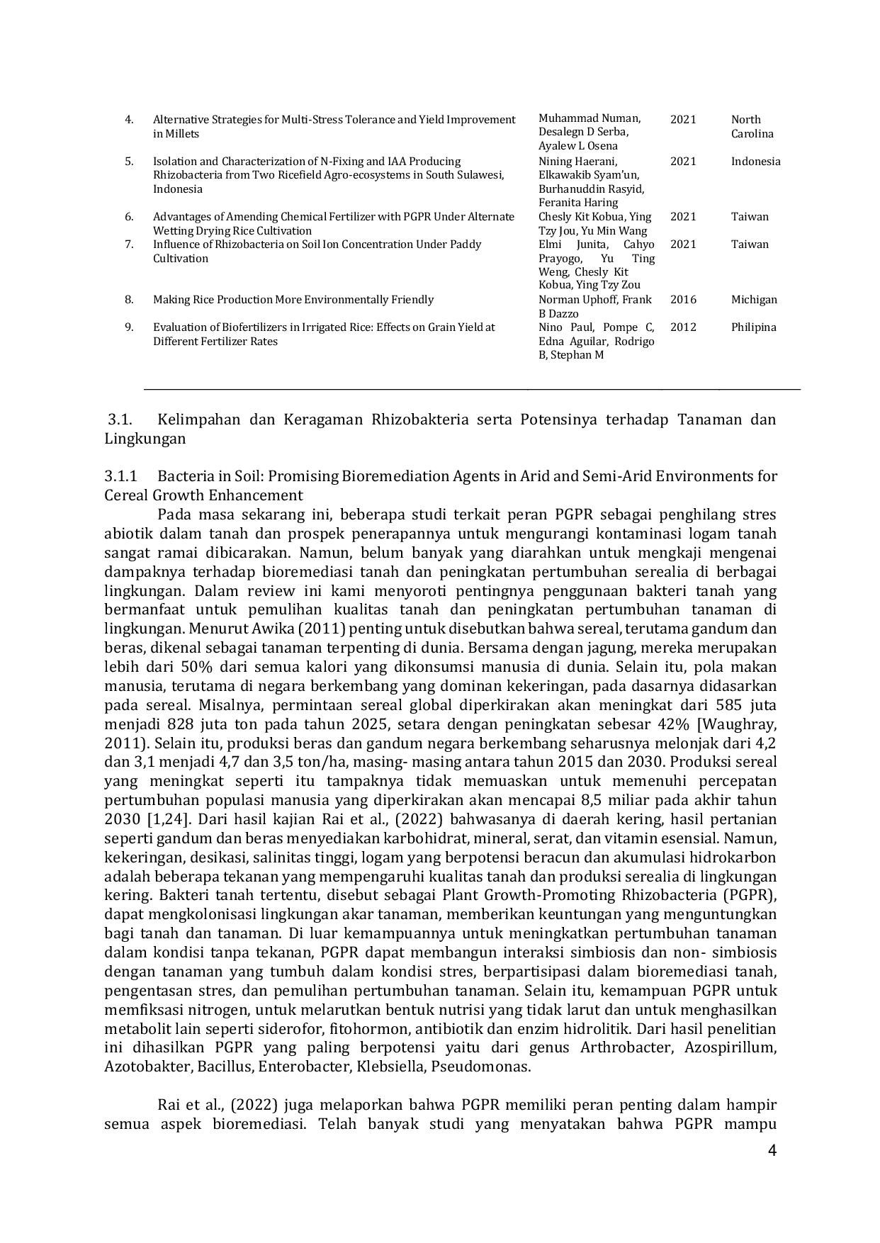 Berdasarkan tinjauan pustaka, penelitian lanjutan dapat difokuskan pada identifikasi dan karakterisasi lebih mendalam mengenai mekanisme spesifik yang digunakan oleh Rhizobakteria dalam meningkatkan toleransi tanaman padi terhadap berbagai stres abiotik, seperti kekeringan dan salinitas. Hal ini dapat dilakukan melalui pendekatan genomik dan metabolomik untuk mengungkap gen dan jalur metabolisme yang terlibat. Selain itu, penelitian perlu dilakukan untuk menguji efektivitas kombinasi berbagai strain Rhizobakteria dengan dosis pupuk kimia yang berbeda untuk mencapai hasil panen yang optimal sekaligus meminimalkan dampak negatif terhadap lingkungan. Terakhir, studi lebih lanjut diperlukan untuk mengeksplorasi potensi Rhizobakteria dalam memfasilitasi fitoremediasi tanah yang tercemar logam berat atau residu pestisida, dengan mempertimbangkan interaksi antara mikrob, tanaman, dan lingkungan tanah secara keseluruhan. Penelitian-penelitian ini diharapkan dapat memberikan kontribusi signifikan dalam pengembangan strategi pertanian berkelanjutan yang ramah lingkungan dan meningkatkan produktivitas tanaman padi.