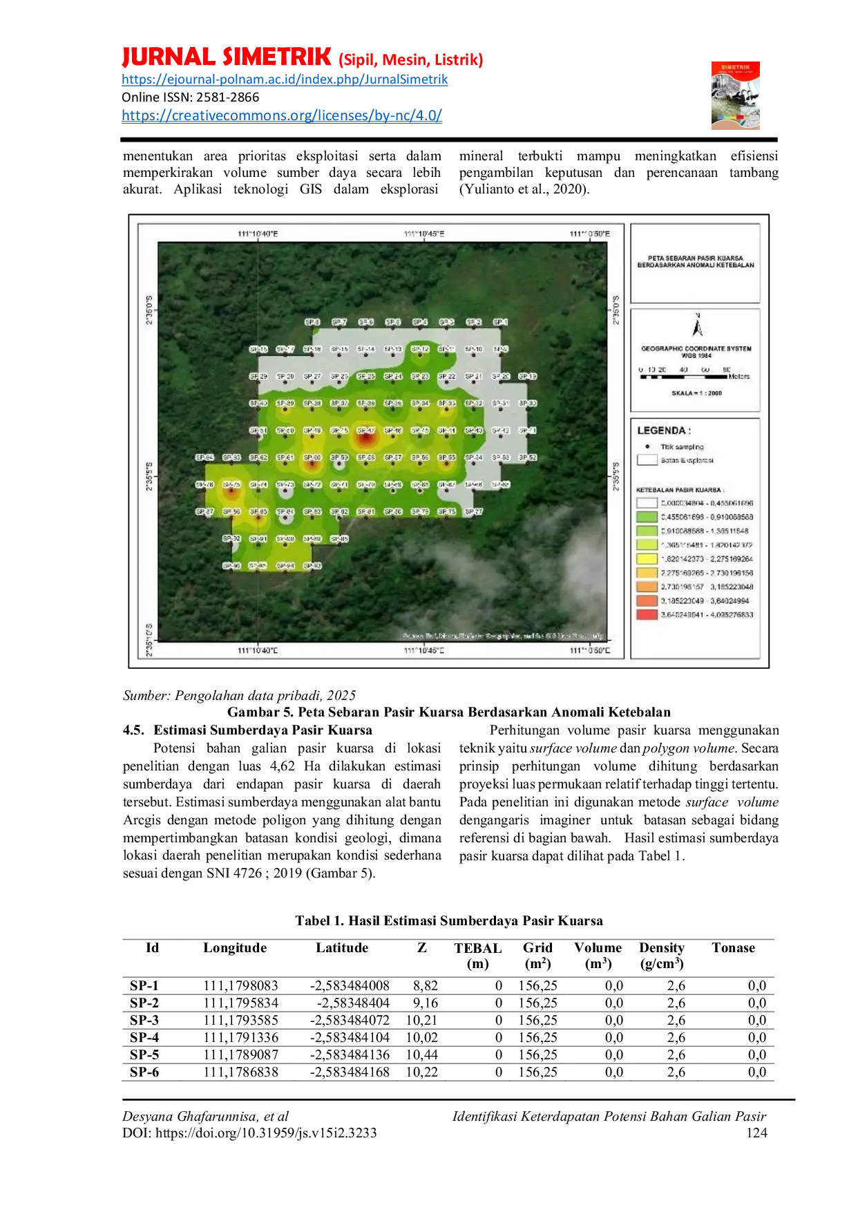 JURNAL SIMETRIKJURNAL SIMETRIKPasir kuarsa memainkan peran vital dalam berbagai industri karena sifat dan aplikasinya yang unik. Penelitian ini dilakukan di Teluk Madang, Sukamara, untuk menentukan distribusi dan ketebalan pasir kuarsa serta memperkirakan potensi sumber dayanya. Metode penelitian melibatkan observasi lapangan langsung, yang kemudian diolah menjadi data spasial dan perhitungan sumber daya menggunakan metode poligon. Berdasarkan peta geologi regional, area penelitian terdiri dari tiga formasi geologi yang menunjukkan potensi akumulasi pasir kuarsa. Observasi geomorfologi mengidentifikasi tiga satuan lahan: dataran aluvial (51%), dataran rawa (20%), dan daratan bergelombang (29%). Sebanyak 96 lubang bor dilakukan di area penelitian seluas 4,62 hektar. Ketebalan lapisan pasir kuarsa bervariasi, dengan ketebalan maksimum 3,6-4 meter dan minimum 0,4 meter. Rata-rata ketebalan berkisar antara 1,3-1,8 meter. Menggunakan metode poligon, volume sumber daya pasir kuarsa diperkirakan sebesar 12.225 m³, dengan kepadatan 2,6 g/cm³, menghasilkan total perkiraan tonase pasir silika sekitar 31.785 ton.