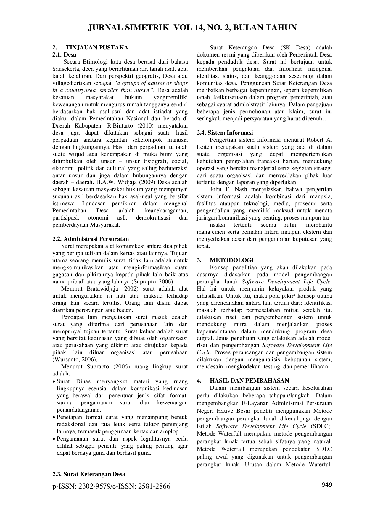 JURNAL SIMETRIKJURNAL SIMETRIKNegeri Hative Besar merupakan salah satu Negeri Adat yang terletak di kecamatan Teluk Ambon pulau Ambon, Kabupaten Kota Ambon. Kepala Pemerintahan Negeri Adat umumnya dipanggil “Bapa Raja (selanjutnya untuk mempersingkat penulisan disebut Raja). Dalam hal menjalankan tata kelola pemerintahan di Negeri Hative Besar, Raja dibantu pegawai pemerintahan lainnya menjalankan tugas pada Kantor Pemerintahan Negeri Hative Besar beralamat pada jalan Dr. J. Leimena, kecamatan Teluk Ambon pulau Ambon, Kabupaten Kota Ambon. Dalam pelaksanaannya kantor Pemerintahan Negeri Hative Besar melakukan pelayanan kependudukan. Berdasarkan data statistik kependudukan Negeri Hative Besar memiliki jumlah kepala keluarga sebanyak 1241 KK, dengan jumlah jiwa sebanyak 4827 Orang (Data Kependudukan Negeri Hative Besar Tahun 2023). Dalam proses pelayanan administrasi pada kantor Pemerintahan Negeri Hative Besar ditangani oleh tenaga operator administrasi. Hal-hal yang ditangani antara lain pelaporan data ke kementerian, layanan administrasi data penduduk dalam hal registrasi dan pembaruan data, serta pembuatan surat keterangan. tata kelola data pada Pemerintahan Negeri Hative Besar dapat dikatakan belum maksimal. Hal ini dikarenakan proses-proses yang masih dilakukan secara manual/ konvensional, misalnya perhitungan dan demografi data kependudukan yang dilakukan secara manual, pembuatan surat keterangan yang dikeluarkan pemerintah negeri, maupun proses input data kependudukan yang ditangani oleh tenaga administrasi/ operator teknologi informasi. Selain itu informasi yang disampaikan pada papan informasi yang berada pada lokasi gedung pemerintahan hative besar dirasa kurang efisien. Informasi yang disampaikan dalam bentu hardcopy setiap informasi dan tidak up-to-date. Pada penelitian ini akan dirancang dan dibangun sebuah sistem informasi yang dapat menangani proses pengajuan Surat keterangan desa dan sebuah papan informasi berbasis digital. Proses rancang bangun ini akan menggunakan metode pengembangan sistem waterfall model. Tujuan penelitian yang diusulkan adalah mengembangkan aplikasi layanan pengajuan surat keterangan dan pengembangan papan informasi digital sebagai layanan informasi publik.