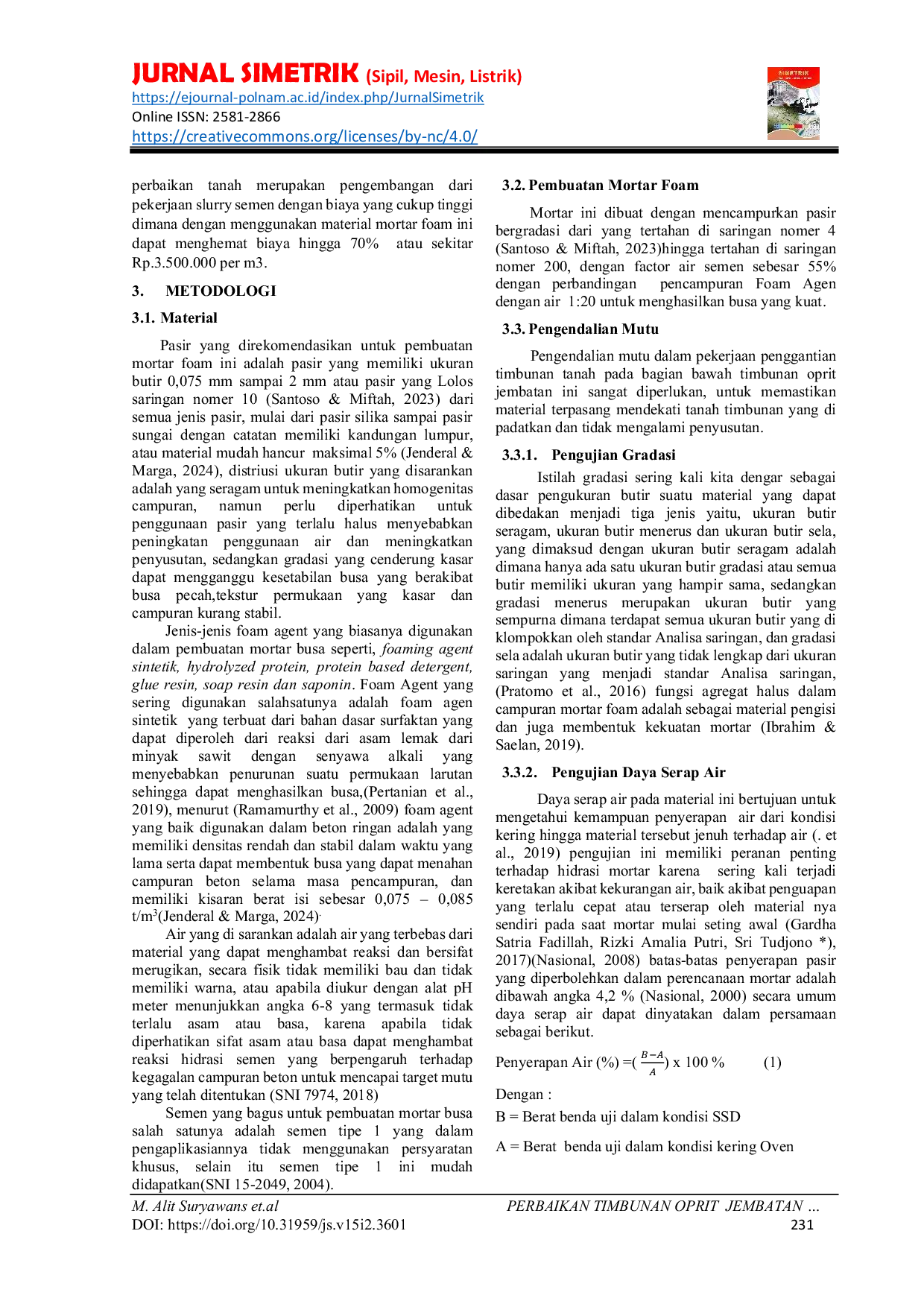 JURNAL SIMETRIKJURNAL SIMETRIKPerbaikan pekerjaan pada jalan tol patro papri di km 146 950 jembatan Cipamongkolan yang mengalami penurunan tanah akibat beban di atasnya (settlement) sehingga terdapat celah atau rongga kecil mendatar, inovasi metode kerja yang digunakan untuk memperbaiki masalah ini adalah dengan menggabungkan metode injeksi grouting semen dengan material mortar foam. Alat yang digunakan memiliki kapasitas injeksi 15-30 m3/jam dengan tekanan 3 HP dan daya 1 fase. Tujuan dari metode ini adalah untuk efisiensi biaya perbaikan dengan membandingkan harga injeksi semen yang biasanya digunakan sebagai bahan injeksi untuk perbaikan struktur dengan harga mortar foam, yaitu Rp. 10.800.000,00 per m3 untuk injeksi semen dan Rp. 3.500.000,00 per m3 untuk mortar foam. Target kepadatan yang diperlukan adalah 800 KPa pada usia 28 hari. Keunggulan dari material mortar foam adalah memiliki berat ringan, tidak mengecil, dan tidak memerlukan proses pemadatan saat digunakan untuk menggantikan tanah timbunan dasar.