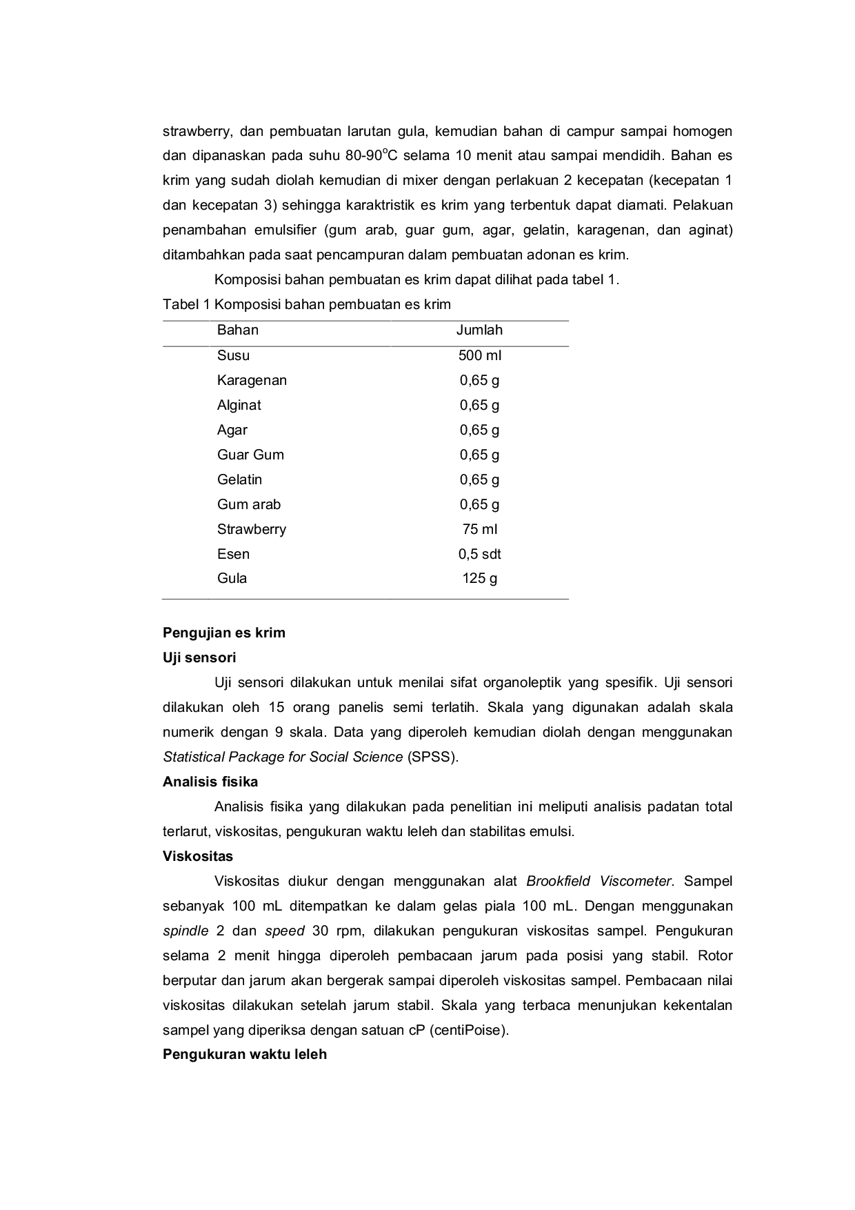 Jurnal Perikanan TerpaduJurnal Perikanan TerpaduEs krim merupakan sejenis makanan semi padat yang dibuat dengan cara pembekuan tepung es krim atau campuran susu, lemak hewani atau nabati, gula dan dengan atau tanpa stabilizer. Proses pembuatan es krim tersebut terbentuk sistem emulsi beku, sehingga mutu es krim yang dihasilkan akan sangat dipengaruhi oleh cara pengolahan dan bahan termasuk stabilizer yang digunakan. Penelitian ini dilakukan bertujuan untuk melihat pengaruh emulsifier dan kecepatan pengadukan yang berbeda terhadap kualitas es krim. Metode pengujian kualitas es krim mencakup pengujian sensori dengan menggunakan score sheet dan analisis fisika. Perlakuan yang digunakan yaitu penggunaan emulsifier yang berbeda (gum arab, guar gum, agar, gelatin, karagenan, dan alginat) sedangkan perlakuan pengadukan dengan menggunakan mixer (kecepatan 1 dan 3).