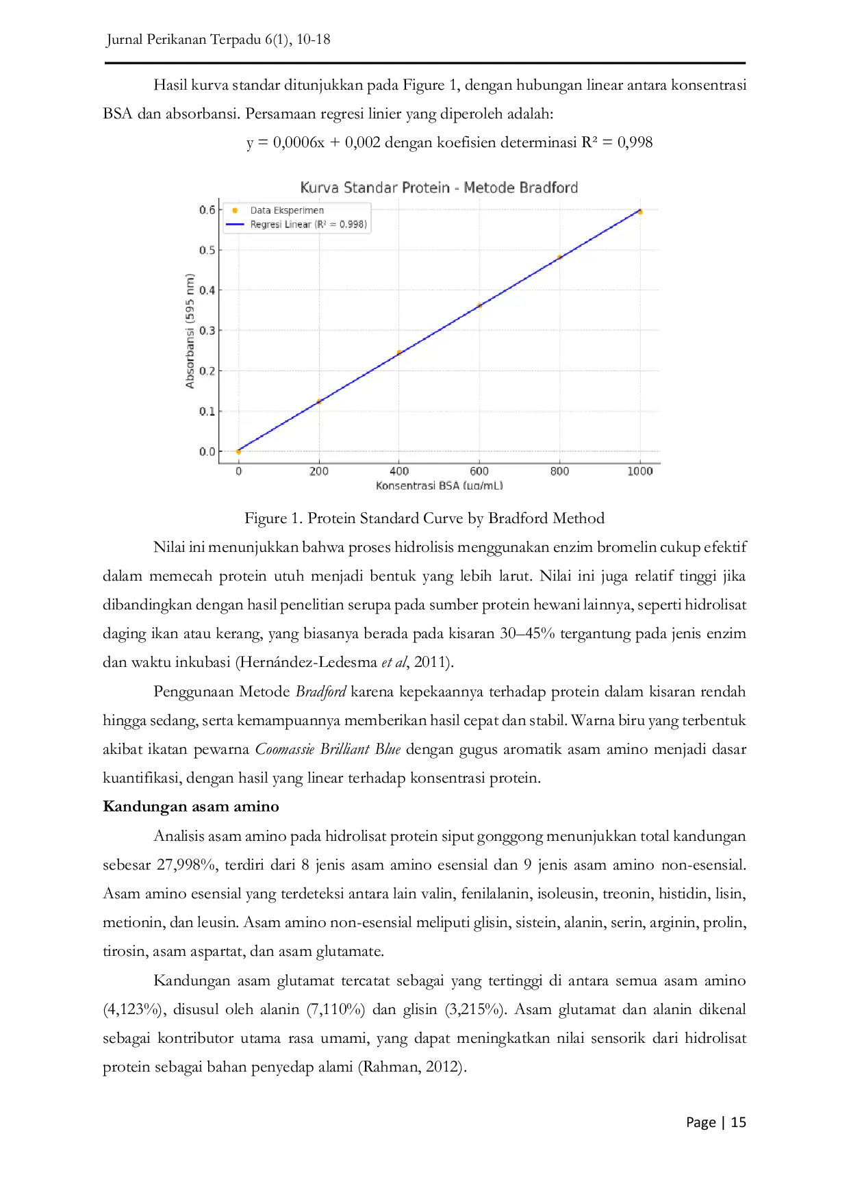 Jurnal Perikanan TerpaduJurnal Perikanan TerpaduPenelitian ini bertujuan untuk menentukan karakteristik kimia hidrolisat protein siput gonggong (Strombus sp). Metode penelitian terdiri dari 2 tahap, yaitu 1) pembuatan tepung siput gonggong dan analisis komposisi kimia serta 2) pembuatan hidrolisat protein siput gonggong menggunakan enzim bromelin 2% dan analisis komposisi kimia. Parameter tepung yang diamati adalah kadar air, abu, protein, lemak, dan rendemen. Sementara itu, parameter komposisi hidrolisat protein yang diamati adalah derajat hidrolisis, protein terlarut, dan asam amino. Hasil penelitian menunjukkan bahwa komposisi kimia tepung siput gonggong adalah kadar air 9,30% (ww), kadar abu 7,09% (dw), kadar protein 73,42% (dw), kadar lemak 7,54% (dw), dan rendemen tepung siput gonggong adalah 87,5%. Sementara itu, komposisi kimia hidrolisat protein siput gonggong adalah derajat hidrolisis 78,5%, protein terlarut 69%, dan total asam amino 27,998%.