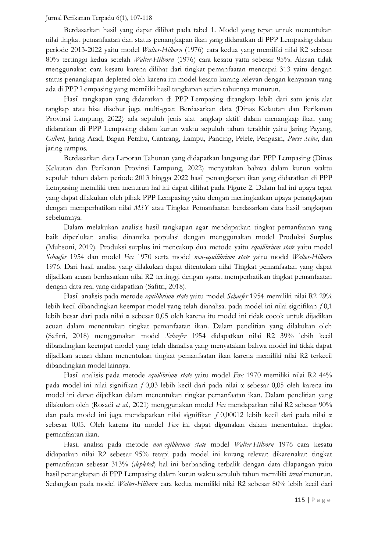 Jurnal Perikanan TerpaduJurnal Perikanan TerpaduProvinsi Lampung memanfaatkan sumber daya ikan hingga 380.000 ton per tahun dari total stok ikan yang didaratkan di pelabuhan perikanan yang ada. Salah satunya adalah Pelabuhan Perikanan Pantai (PPP) Lempasing, yang memiliki lokasi strategis dan berbatasan langsung dengan Teluk Lampung. Namun, berdasarkan laporan tahunan PPP Lempasing dari tahun 2013 hingga 2022, hasil tangkapan yang didaratkan cenderung menurun setiap tahun. Oleh karena itu, perlu dilakukan pemanfaatan sumber daya ikan secara maksimal. Dalam penelitian ini, stok ikan dianalisis menggunakan pendekatan produksi surplus menggunakan metode equilibrium state, model Schaefer 1954, dan model Fox 1970, serta model non-equilibrium state, model Walter-Hilborn 1976, cara satu dan dua. Hasil analisis menunjukkan bahwa model yang tepat untuk menentukan tingkat pemanfaatan dan status penangkapan adalah model Walter-Hilborn cara kedua, yang memiliki nilai R2 tertinggi kedua yaitu 80%. Meskipun model Walter-Hilborn cara satu memiliki nilai R2 tertinggi yaitu 95%, namun dengan tingkat pemanfaatan sebesar 313%, hal ini kurang relevan karena tidak sesuai dengan fakta di lapangan. Berdasarkan model Walter-Hilborn cara kedua, tingkat pemanfaatan di PPP Lempasing mencapai 97%, yang berarti telah dieksploitasi sepenuhnya. Disarankan untuk memanfaatkan sumber daya ikan dengan nilai YMSY 713 ton/tahun, FMSY 1240 ton/tahun, dan YJTB 571 trip/tahun, dengan setiap trip (UMSY) dapat menangkap sebanyak 0.58 tangkapan. Upaya penangkapan juga dapat ditingkatkan, tetapi dengan mempertimbangkan nilai stok berkelanjutan atau stok ikan yang ada pada kedalaman 727 ton.