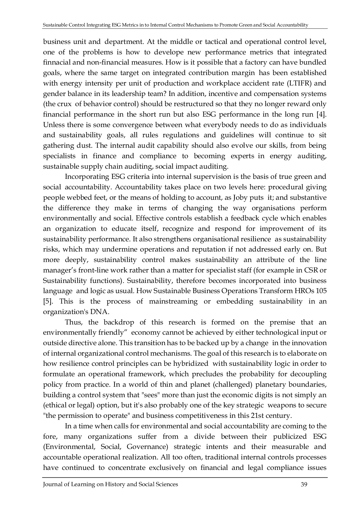 Journal of Learning on History and Social SciencesJournal of Learning on History and Social SciencesThis study aims to explore the integration of Environmental, Social, and Governance (ESG) factors into internal control mechanisms, specifically focusing on the development of sustainable controls within organizations. The research adopts a qualitative approach, utilizing library research and qualitative content analysis with a thematic method. The findings indicate that the Sustainable Control Concept Model develops a system derived from traditional internal control, structured around ESG principles. ESG metrics are identified as critical operational control tools, with integration success depending on material selection, measurability (SMART), and alignment with performance management systems, such as the Balanced Scorecard. Additionally, governance reforms, particularly in the roles of the board and audit committees, are necessary for effective green and social accountability. Effective sustainability controls are linked to improved operational performance, enhanced reputation, and long-term value creation. This study contributes a model that bridges the gap between qualitative ESG criteria and quantitative internal control systems, offering new insights into the role of internal audits in ensuring sustainability effectiveness.