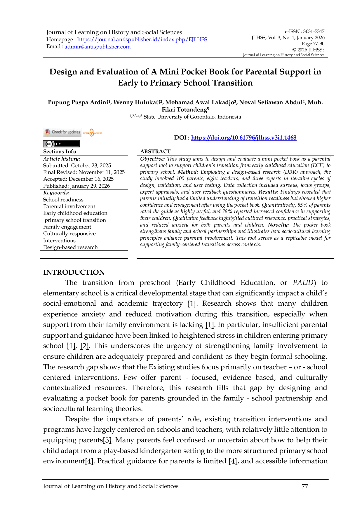 Journal of Learning on History and Social SciencesJournal of Learning on History and Social SciencesPenelitian ini bertujuan untuk merancang dan mengevaluasi buku saku mini sebagai alat dukungan orang tua dalam mendukung transisi anak dari pendidikan anak usia dini (PAUD) ke sekolah dasar. Pendekatan penelitian yang digunakan adalah penelitian berbasis desain (DBR), yang melibatkan 100 orang tua, delapan guru, dan tiga ahli dalam siklus iteratif desain, validasi, dan pengujian pengguna. Pengumpulan data mencakup survei, kelompok fokus, penilaian ahli, dan kuesioner umpan balik pengguna. Temuan menunjukkan bahwa orang tua awalnya memiliki pemahaman terbatas tentang kesiapan transisi, tetapi menunjukkan kepercayaan dan keterlibatan yang lebih tinggi setelah menggunakan buku saku. Secara kuantitatif, 85% orang tua menilai panduan sebagai sangat berguna, dan 78% melaporkan peningkatan kepercayaan dalam mendukung anak-anak mereka. Umpan balik kualitatif menekankan relevansi budaya, strategi praktis, dan penurunan kecemasan bagi orang tua dan anak-anak. Keunikan buku saku ini memperkuat kemitraan keluarga dan sekolah serta menggambarkan bagaimana prinsip belajar sosiokultural meningkatkan keterlibatan orang tua. Alat ini berfungsi sebagai model yang dapat diulang untuk mendukung transisi yang berpusat pada keluarga di berbagai konteks.