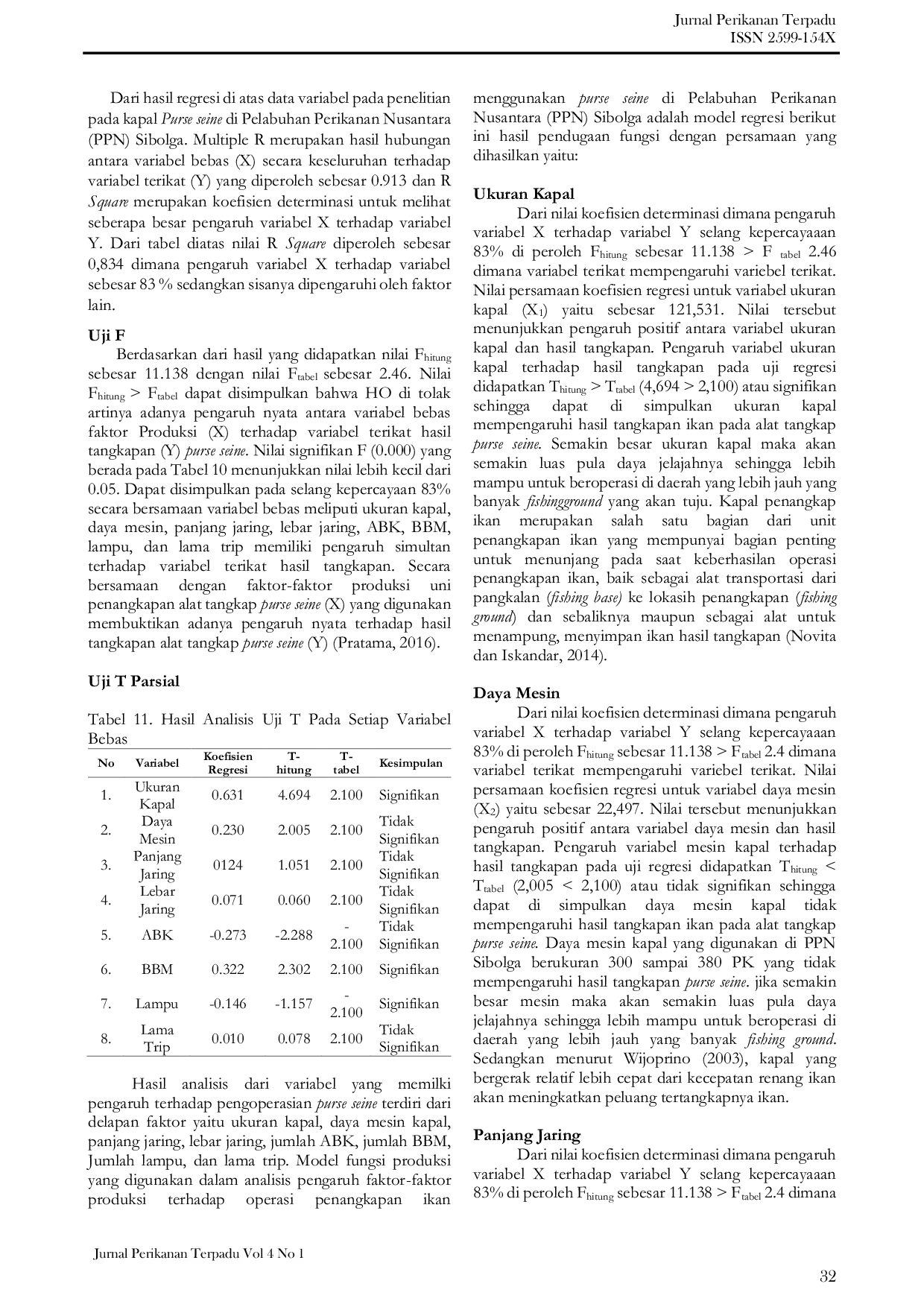 Jurnal Perikanan TerpaduJurnal Perikanan TerpaduPelabuhan Perikanan Nusantara (PPN) Sibolga adalah tempat kapal-kapal perikanan bersandar untuk mengurus izin berlayar dan membongkar hasil tangkapan. Faktor-faktor produksi yang diduga berpengaruh terhadap hasil produksi meliputi ukuran kapal, kekuatan mesin, bahan bakar minyak, panjang jaring, lebar jaring, jumlah ABK, air tawar, perbekalan, jumlah lampu, dan lama trip penangkapan. Penelitian ini bertujuan untuk menentukan pengaruh faktor-faktor produksi terhadap keberhasilan operasi penangkapan purse seine di PPN Sibolga.