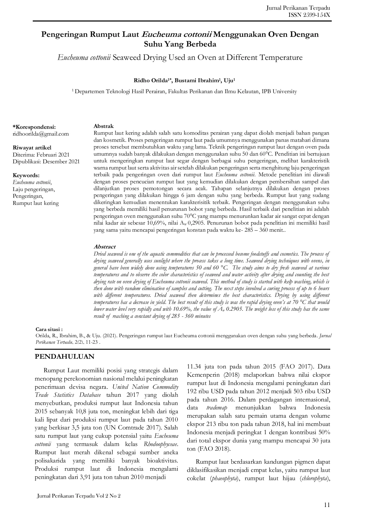 Jurnal Perikanan TerpaduJurnal Perikanan TerpaduDried seaweed is one of the aquatic commodities that can be processed become foodstuffs and cosmetics. The process of drying seaweed generally uses sunlight where the process takes a long time. Seaweed drying techniques with ovens, in general have been widely done using temperatures 50 and 60 °C. The study aims to dry fresh seaweed at various temperatures and to observe the color characteristics of seaweed and water activity after drying and counting the best drying rate on oven drying of Eucheuma cottonii seaweed.