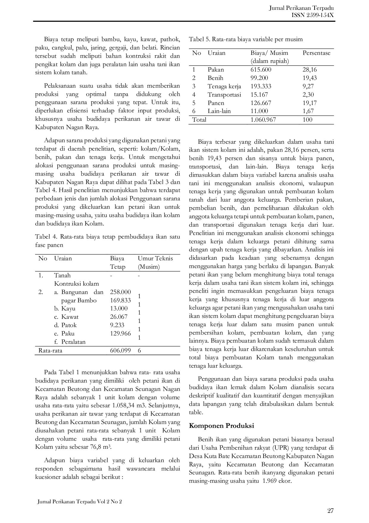 Jurnal Perikanan TerpaduJurnal Perikanan TerpaduPengambilan data pada penelitian ini dilakukan pada bulan April sampai dengan Mei 2018 yang berlokasi di dua kecamatan, yaitu di Kecamatan Beutong dan Kecamatan Seunagan Kabupaten Nagan Raya. Metode pengambilan data dilakukan secara sensus dengan sasaran responden pembudidaya ikan untuk pengambilan data primer. Analisis finansial diperoleh melalui kajian terhadap data primer pembudidaya ikan dengan nilai finansial B/C ratio sebesar 2,25, perhitungan pendapatan menggunakan rumus π = TR – TC. Hasil yang diperoleh nilai sebesar Rp 2.087.234/panen alokasi biaya terbesar dikeluarkan petani untuk masing-masing usaha terdapat pada biaya pakan yaitu Rp 33.632.181,81 (77,72%) dan Rp.15.354.046.89 (46,46%) dari total biaya yang dikeluarkan petani ikan. Keuntungan yang diterima petani ikan untuk masing-masing usaha yaitu sebesar Rp 4.241.255,56/periode produksi untuk usaha budidaya ikan nila dan ikan Mas dalam kolam dan Rp 3.708.062,35/periode produksi. Faktor yang mempengaruhi pendapatan usaha ikan nila dan ikan mas adalah benih ikan, pupuk, dan pakan.