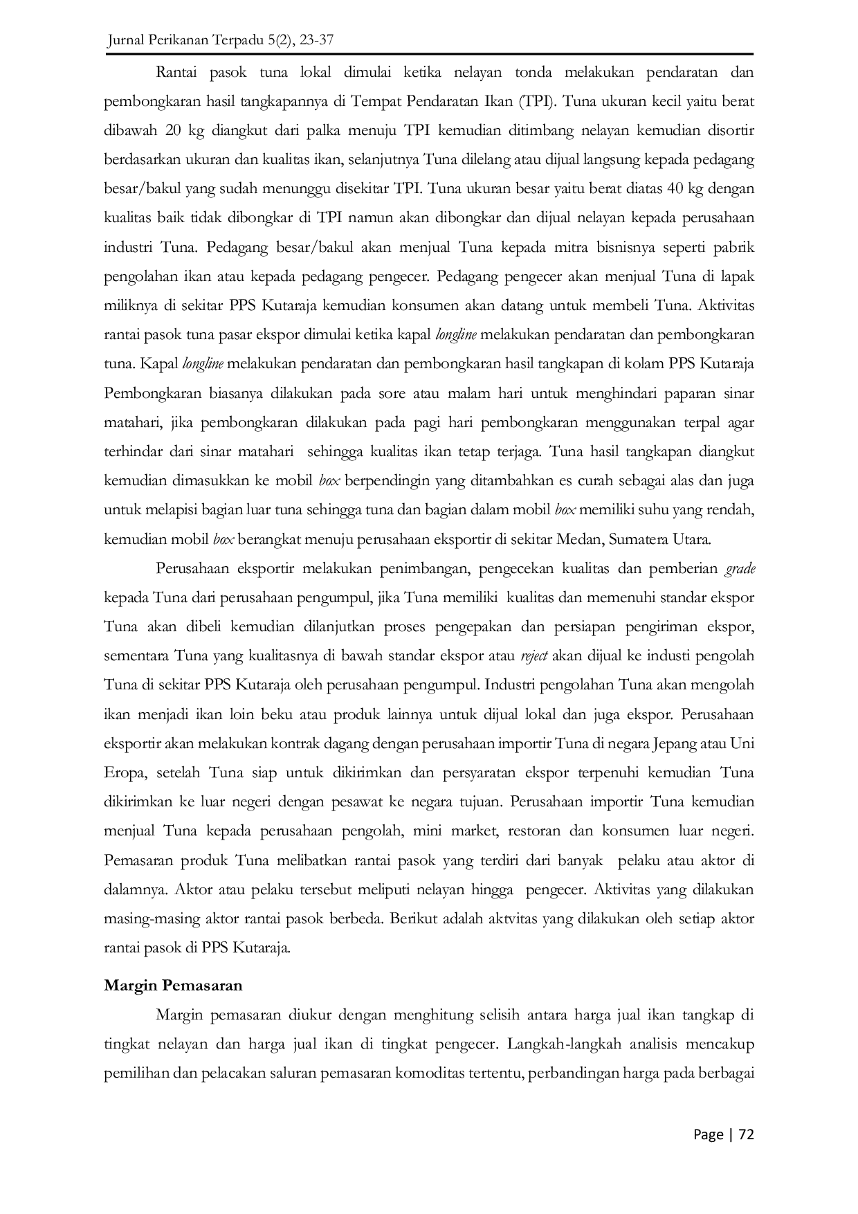Jurnal Perikanan TerpaduJurnal Perikanan TerpaduIndustri perikanan tuna merupakan sektor strategis dalam industri perikanan Indonesia, menawarkan nilai ekonomi tinggi dan potensi ekspor yang signifikan. Penelitian ini bertujuan untuk menganalisis sistem ketelusuran rantai pasok dan margin pemasaran perikanan tuna di Pelabuhan Perikanan Samudera (PPS) Kutaraja, Banda Aceh. Metode survei digunakan untuk mengumpulkan data melalui wawancara terstruktur dengan teknik purposive sampling. Hasil penelitian menunjukkan bahwa rantai pasok perikanan tuna melibatkan berbagai pihak, mulai dari nelayan, pedagang lokal (toke bangku), pabrik pengolahan, hingga eksportir. Margin pemasaran tertinggi, mencapai 20%, ditemukan pada tingkat pengolahan. Implementasi sistem ketelusuran belum terintegrasi secara penuh, terutama pada tahap distribusi dan pengolahan. Analisis kesenjangan menunjukkan perbedaan signifikan antara standar ketelusuran ekspor dan praktik saat ini di PPS Kutaraja. Kebijakan terintegrasi untuk memperkuat sistem ketelusuran, memberikan insentif kepatuhan, dan mengembangkan infrastruktur rantai dingin sangat penting untuk meningkatkan daya saing ekspor tuna Indonesia dan meningkatkan kesejahteraan nelayan lokal.