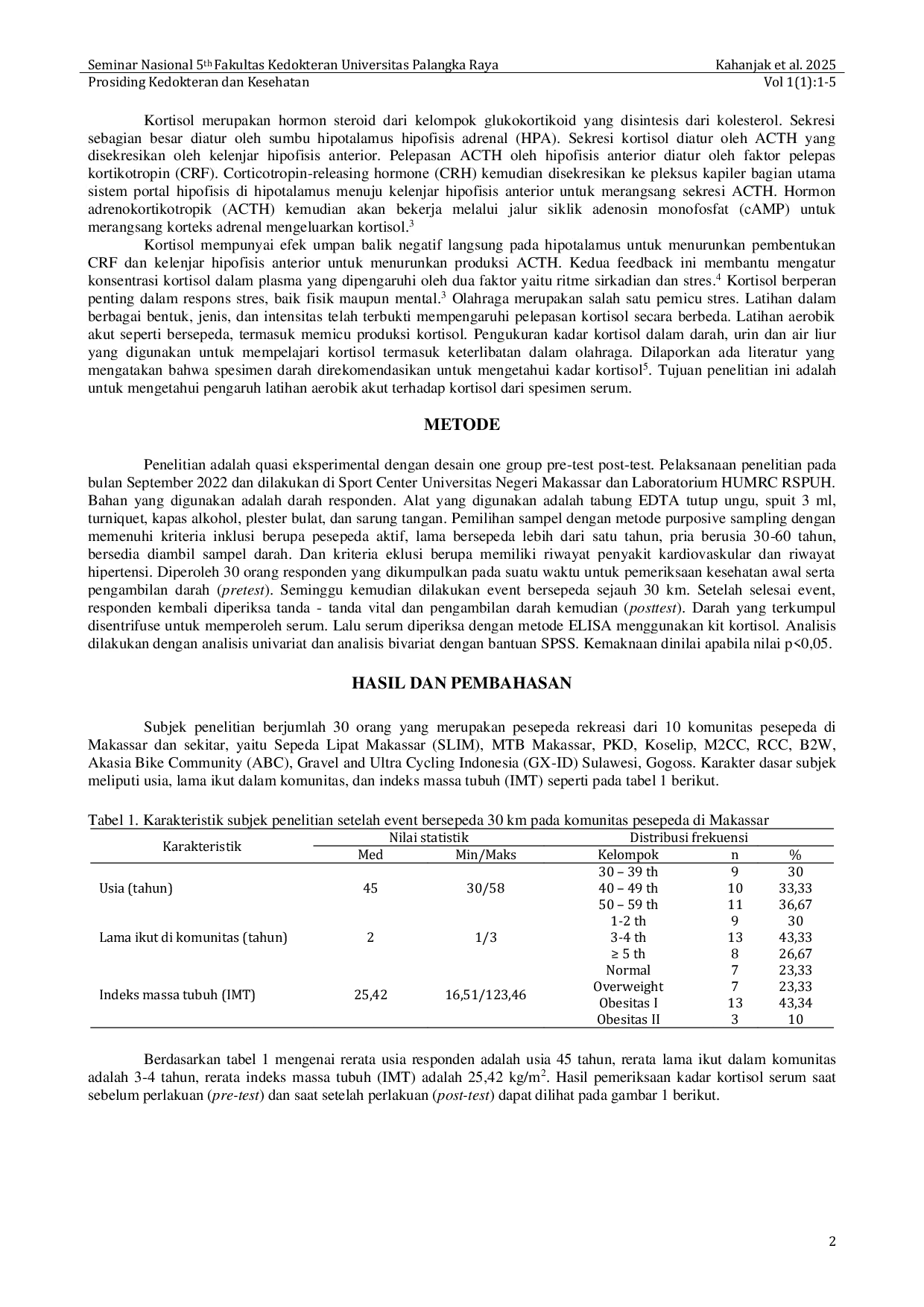 Prosiding Seminar Nasional Fakultas Kedokteran Universitas Palangka RayaProsiding Seminar Nasional Fakultas Kedokteran Universitas Palangka RayaGlukosa darah merupakan sumber energi utama saat berolahraga terutama pada olahraga daya tahan seperti bersepeda, oleh karena itu, pada penelitian ini akan dilakukan pengukuran kadar korstisol serum sebelum dan setelah diberikan perlakuan berupa latihan bersepeda sejauh 30 km. Tujuan penelitian ini bertujuan untuk mengetahui perubahan kadar kortisol serum setelah event bersepeda 30 km pada komunitas pesepeda di Makassar. Metode penelitian adalah quasi eksperimental dengan desain one group pre-test post-test. Pemilihan sampel dengan metode purposive sampling dengan memenuhi kriteria inklusi berupa pesepeda aktif, lama bersepeda lebih dari satu tahun, pria berusia 30-60 tahun, bersedia diambil sampel darah. Kriteria eklusi berupa memiliki riwayat penyakit kardiovaskular dan riwayat hipertensi. Sebanyak 30 orang responden yang dikumpulkan pada suatu waktu untuk pemeriksaan kesehatan awal serta pengambilan darah (pretest). Seminggu kemudian dilakukan event bersepeda sejauh 30 km. Setelah selesai event, responden kembali diperiksa tanda vital dan pengambilan darah kemudian (posttest). Darah yang terkumpul disentrifuse untuk memperoleh serum. Lalu serum diperiksa dengan metode ELISA menggunakan kit kortisol. Hasil, terjadi penurunan kadar kortisol serum secara bermakna sebesar -1,93 µg/dL dari 13,33 µg/dL menjadi 11,34 µg/dL (-14,19%) setelah bersepeda sejauh 30 km. Kesimpulan terdapat perbedaan antara kadar kortisol pretest dan posttest sehingga disimpulkan bahwa bersepeda sejauh 30 km dapat menurunkan kadar kortisol pada pesepeda.