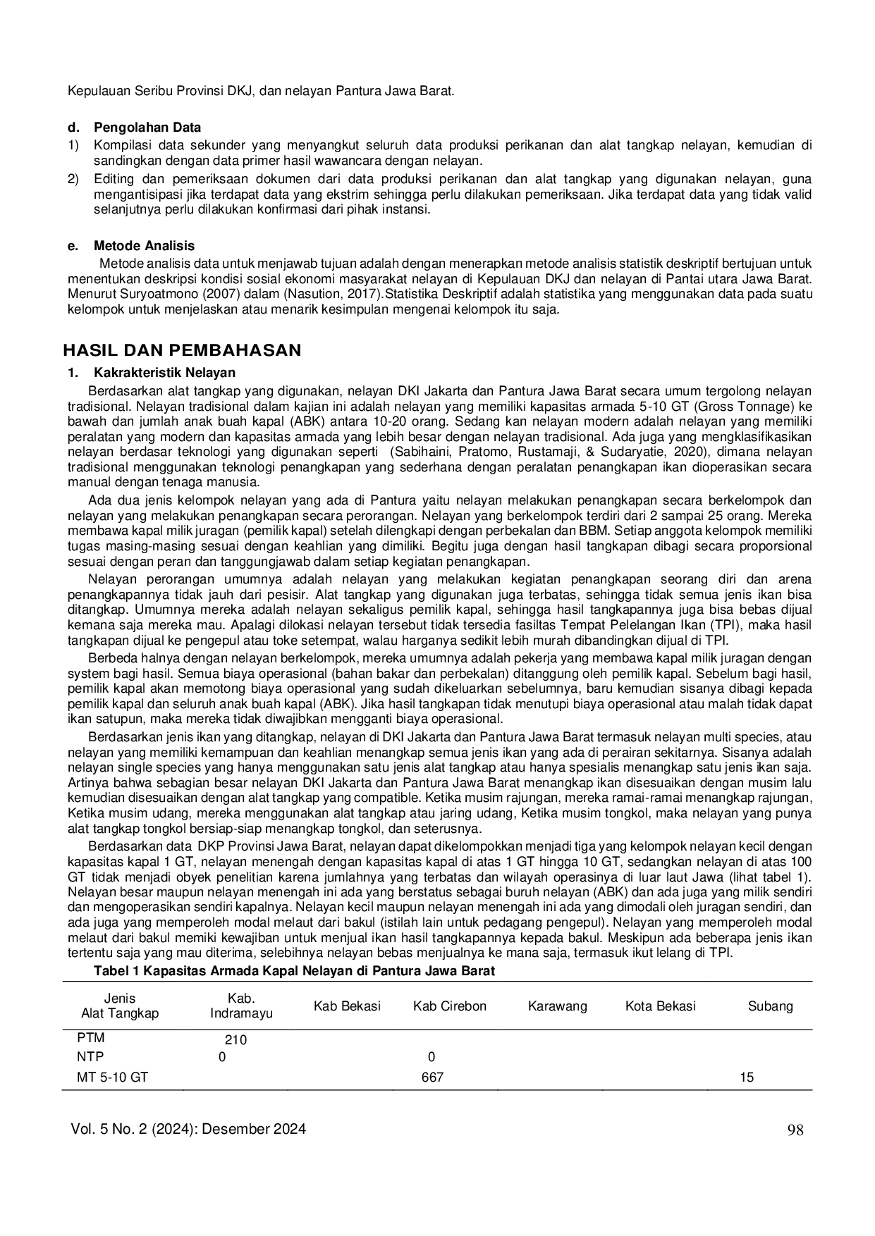 ProspekProspekMasyarakat di pulau-pulau kecil dan wilayah pesisir umumnya bergantung pada produk laut untuk mata pencaharian mereka, baik sebagai nelayan, buruh nelayan, atau penyedia jasa wisata bahari. Pekerjaan nelayan seringkali merupakan warisan dari orang tua. Ketergantungan pada sumber daya kelautan sangat tinggi, namun dengan teknologi penangkapan yang terbatas, hasil yang diperoleh seringkali tidak optimal. Penghasilan dari melaut yang tidak menentu menjadi masalah serius bagi kesejahteraan masyarakat nelayan, bahkan seringkali pendapatan lebih kecil dari pengeluaran, menjebak mereka dalam kemiskinan. Penelitian ini bertujuan untuk menggambarkan karakteristik masyarakat pesisir dari aspek sosial ekonomi di DKI Jakarta dan Pantura Jawa Barat. Metode analisis data yang digunakan adalah analisis statistik deskriptif. Hasil penelitian menunjukkan bahwa sebagian besar nelayan di DKI Jakarta dan Pantura Jawa Barat adalah nelayan tradisional. Tingkat pendidikan generasi nelayan saat ini relatif lebih tinggi dibandingkan generasi sebelumnya, dan generasi berikutnya diharapkan memiliki tingkat pendidikan yang lebih baik lagi. Keterbatasan lapangan kerja memaksa masyarakat pesisir menjadi nelayan dengan modal fisik yang terbatas, meskipun mereka menyadari risiko yang tinggi. Nelayan yang tidak memiliki modal sendiri seringkali bergantung pada tengkulak sebagai sumber permodalan karena prosesnya yang lebih mudah dan cepat.