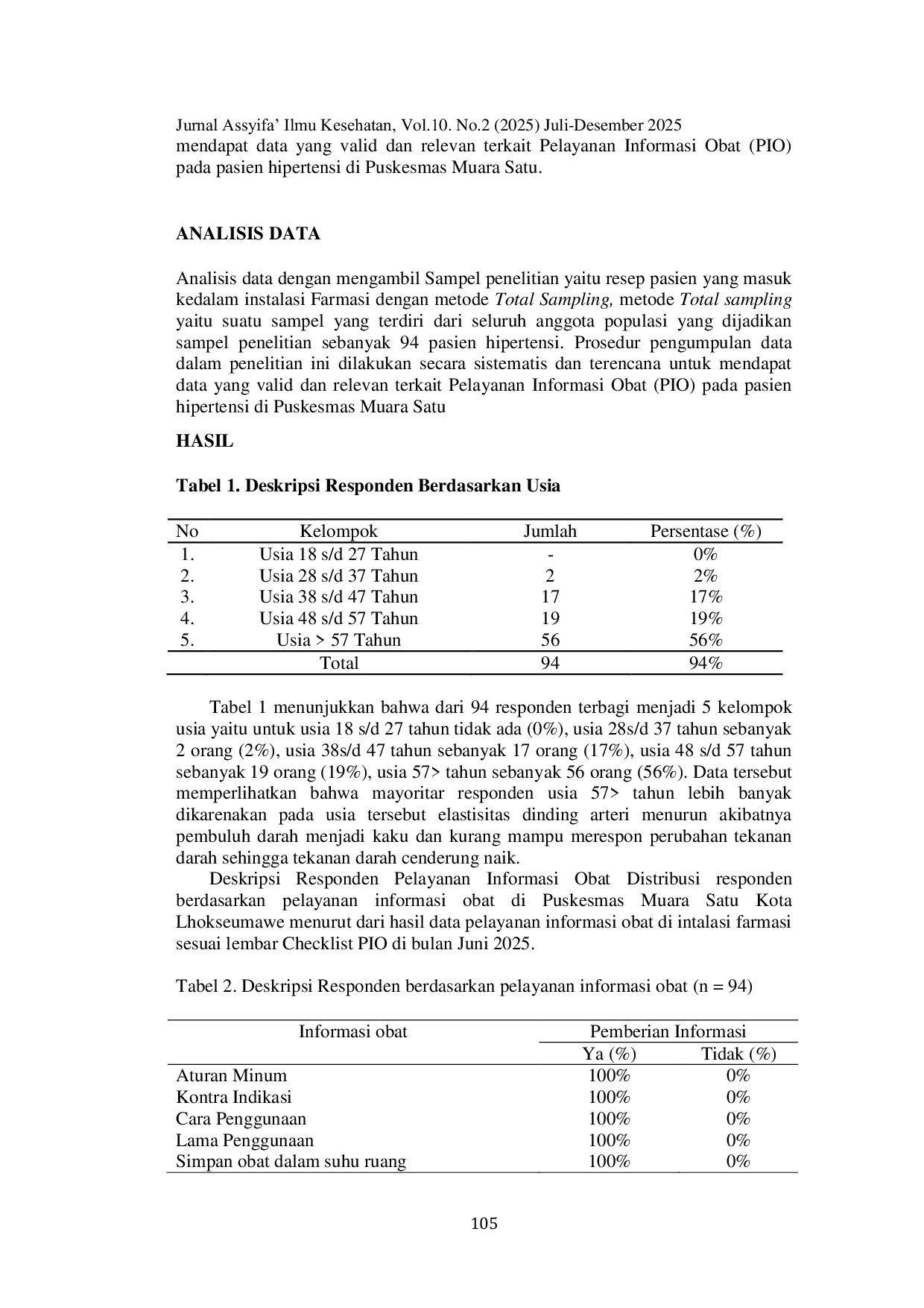Jurnal Assyifa: Jurnal Ilmu Kesehatan LhokseumaweJurnal Assyifa: Jurnal Ilmu Kesehatan LhokseumaweSalah satu bentuk pelayanan kefarmasian di puskesmas adalah Pelayanan Informasi Obat (PIO), yang mencakup pemberian informasi terkait aturan minum, kontraindikasi, cara penggunaan, lama penggunaan, penyimpanan obat dalam suhu ruang, menghindari sinar matahari, tidak menyimpan obat dalam suhu ruang, mengikuti petunjuk penyimpanan pada label atau kemasan, menjauhkan dari jangkauan anak-anak, riwayat alergi, penyebab alergi, memberikan informasi tentang jenis obat penyebab alergi, menghentikan obat yang menyebabkan alergi. Penelitian ini bertujuan mengetahui gambaran Kota Lhokseumawe. Metode penelitian yang digunakan adalah deskriptif kuantitatif dengan teknik total sampling. Populasi penelitian adalah 94 pasien hipertensi yang mengambil obat di Instalasi Farmasi Rawat Jalan Puskesmas Muara Satu pada bulan Juni 2025. Data dikumpulkan menggunakan lembar checklist PIO dan dianalisis secara deskriptif. Hasil penelitian menunjukkan bahwa seluruh responden (100%) menerima informasi lengkap mencakup tiga belas aspek utama. Karakteristik responden didominasi oleh kelompok usia >57 tahun (56%), yang merupakan usia dengan prevalensi hipertensi lebih tinggi akibat perubahan fisiologis terkait penuaan. Temuan ini memperlihatkan bahwa Puskesmas Muara Satu telah menjalankan pelayanan informasi obat sesuai dengan standar Permenkes No. 74 Tahun 2016 tentang Standar Pelayanan Kefarmasian di Puskesmas. Penelitian ini diharapkan dapat menjadi bahan evaluasi bagi puskesmas dalam mempertahankan dan meningkatkan kualitas PIO, serta mendorong masyarakat agar lebih aktif dalam memahami informasi obat guna meningkatkan keberhasilan terapi dan mencegah efek samping.