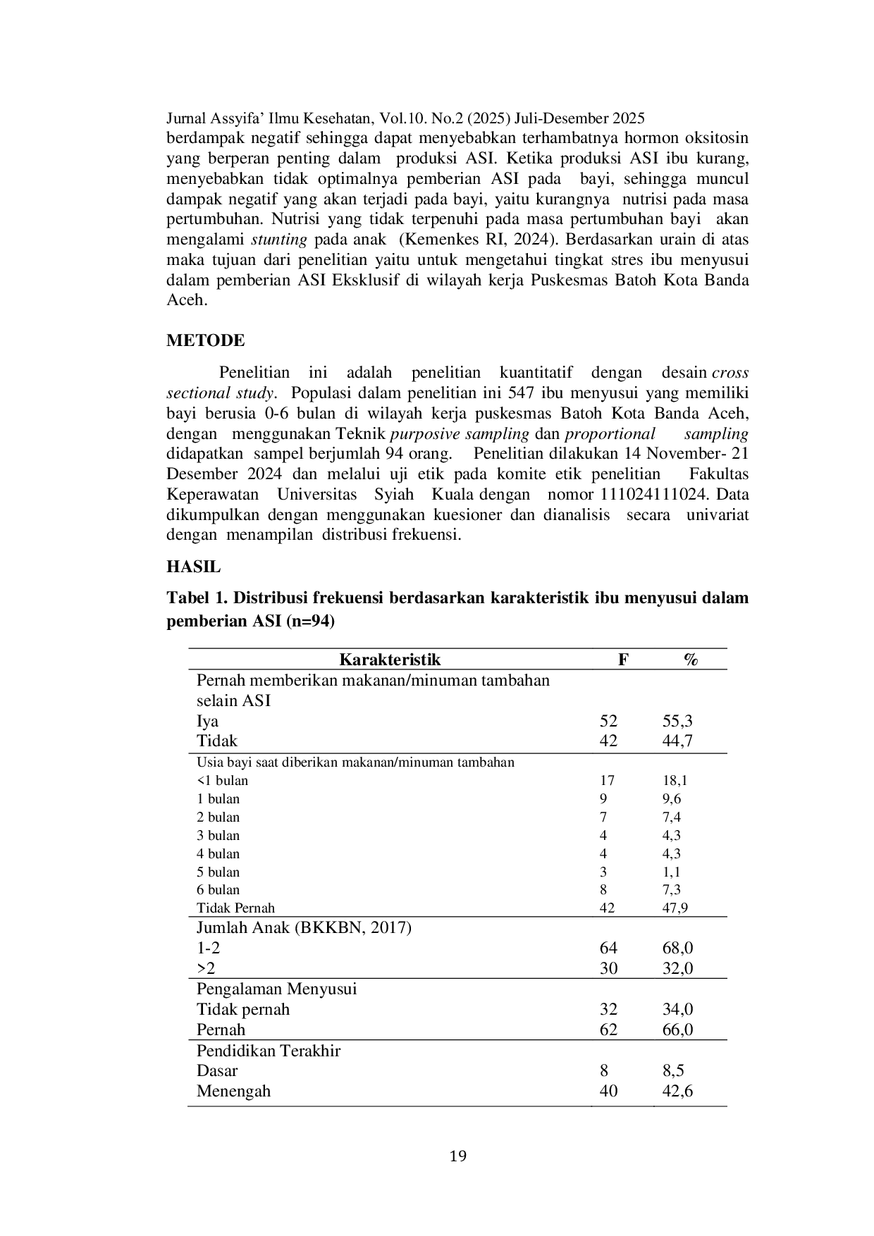 Berdasarkan hasil penelitian, sebagian besar ibu menyusui di Puskesmas Batoh Kota Banda Aceh mengalami stres dalam kategori ringan sebanyak 44 responden (46,8%), disusul stres sedang (36,2%), stres berat (12,8%), dan stres sangat berat (4,3%).Tingkat stres dipengaruhi oleh faktor pengalaman, pendidikan, usia, dan status tempat tinggal ibu.Stres berdampak pada kelancaran produksi ASI, sehingga perlu dilakukan upaya pengelolaan stres untuk mendukung keberhasilan pemberian ASI eksklusif.