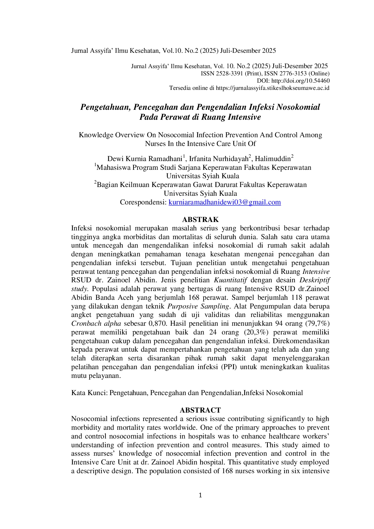 Jurnal Assyifa: Jurnal Ilmu Kesehatan LhokseumaweJurnal Assyifa: Jurnal Ilmu Kesehatan LhokseumaweInfeksi nosokomial merupakan masalah serius yang berkontribusi besar terhadap tingginya angka morbiditas dan mortalitas di seluruh dunia. Salah satu cara utama untuk mencegah dan mengendalikan infeksi nosokomial di rumah sakit adalah dengan meningkatkan pemahaman tenaga kesehatan mengenai pencegahan dan pengendalian infeksi tersebut. Penelitian ini bertujuan untuk mengetahui pengetahuan perawat tentang pencegahan dan pengendalian infeksi nosokomial di Ruang Intensive RSUD dr. Zainoel Abidin. Penelitian kuantitatif dengan desain deskriptif study dilakukan pada 118 perawat yang bertugas di ruang Intensive RSUD dr. Zainoel Abidin Banda Aceh. Hasil penelitian menunjukkan 94 orang (79,7%) perawat memiliki pengetahuan baik dan 24 orang (20,3%) perawat memiliki pengetahuan cukup dalam pencegahan dan pengendalian infeksi. Direkomendasikan kepada perawat untuk dapat mempertahankan pengetahuan yang telah ada dan disarankan pihak rumah sakit dapat menyelenggarakan pelatihan pencegahan dan pengendalian infeksi (PPI) untuk meningkatkan kualitas mutu pelayanan.