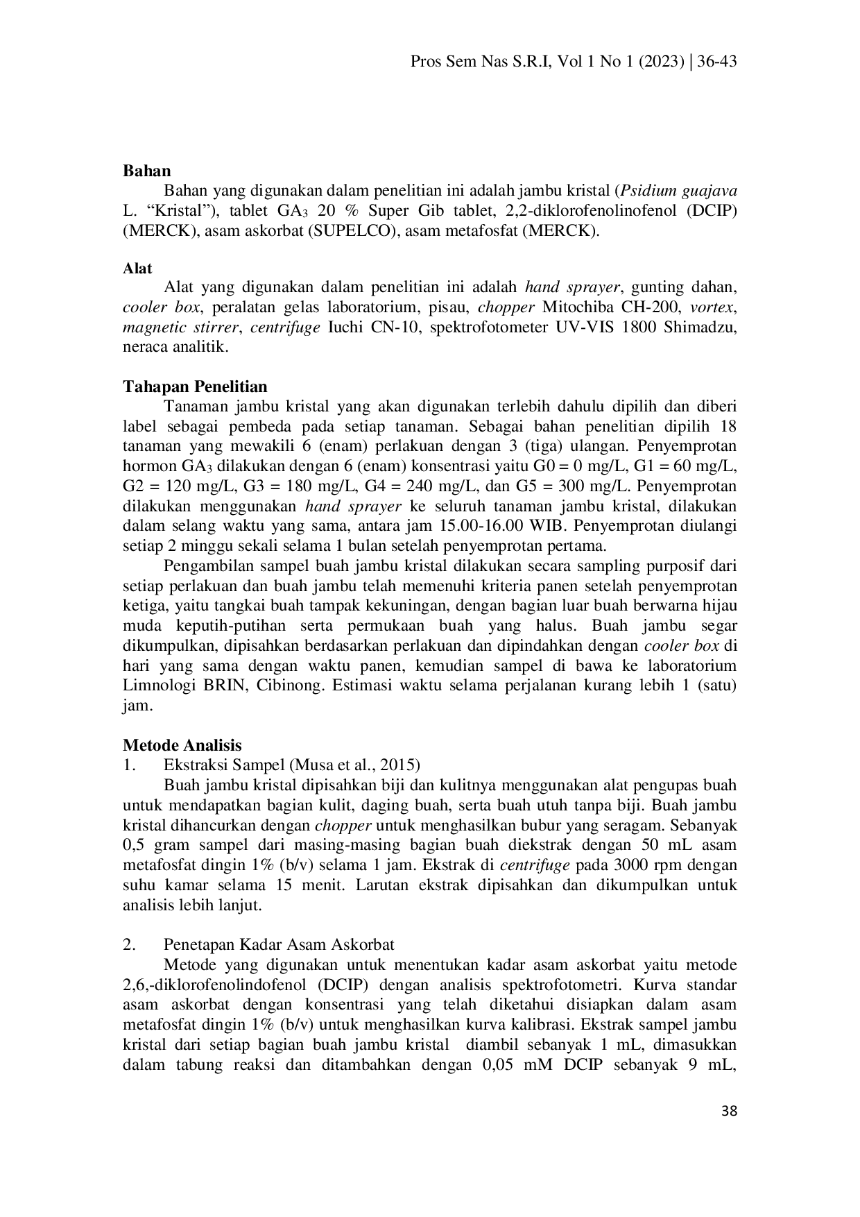 Prosiding Seminar Nasional Sinergi Riset dan InovasiProsiding Seminar Nasional Sinergi Riset dan InovasiJambu kristal merupakan salah satu buah favorit di Indonesia karena daging buahnya yang renyah dan buah yang minim biji. Jambu kristal memiliki kandungan senyawa antioksidan potensial seperti senyawa fenolik dan flavonoid, asam askorbat, karotenoid, dan likopen. Hal ini membuat jambu kristal berpotensi besar untuk dikembangkan dan dibudidayakan dalam rangka pemenuhan gizi masyarakat. Pemberian hormon asam giberelat (GA3) dilakukan untuk meningkatkan kandungan buah, merangsang pembentukkan dan perkembangan buah serta meningkatkan biosintesis metabolit sekunder. Penelitian ini bertujuan untuk mengetahui kandungan asam askorbat pada buah jambu kristal dengan pemberian hormon asam giberelat.