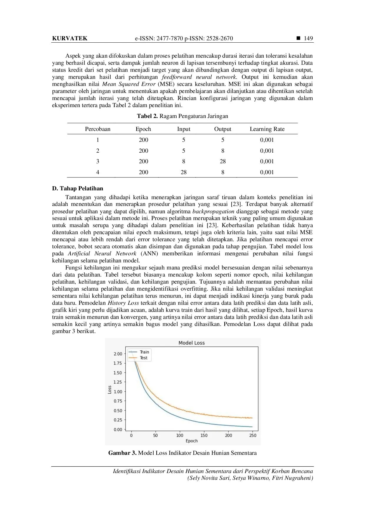 Dari hasil pemodelan metode ANN, dapat disimpulkan bahwa terdapat identifikasi indikator desain hunian sementara berdasarkan perspektif korban bencana terbesar pada indikator Kemudahan Interaksi Sosial yang memiliki presentasi sebesar 33,33%, dilanjutkan dengan indikator Kekuatan Bangunan sebesar 23,33%, 2 indikator selanjutnya adalah Kenyamanan Penghuni dan Kemudahan Pembangunan dengan nilai 20% dan indikator terendah adalah Kecepatan Pembangunan yang memiliki presentasi sebesar 3,33%.