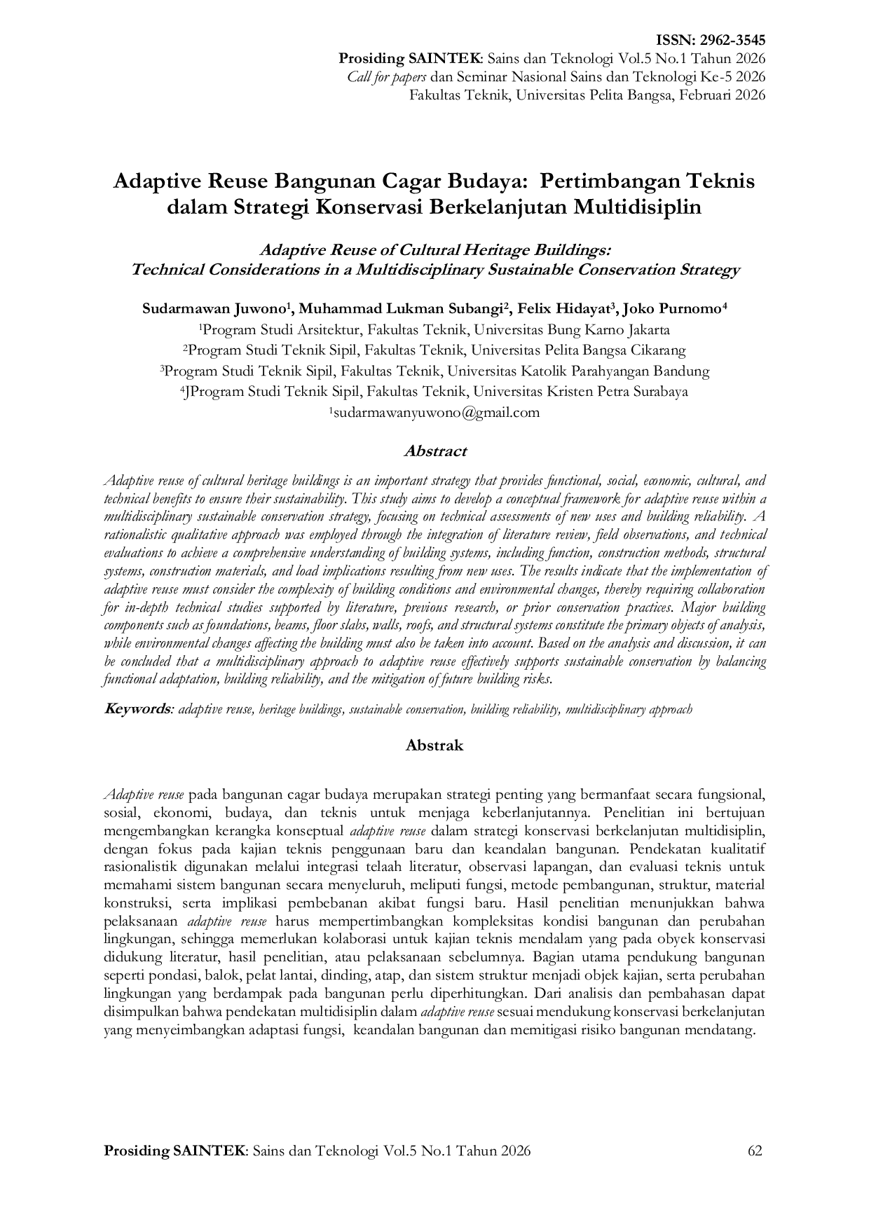 Prosiding Sains dan TeknologiProsiding Sains dan TeknologiAdaptive reuse pada bangunan cagar budaya merupakan strategi penting yang bermanfaat secara fungsional, sosial, ekonomi, budaya, dan teknis untuk menjaga keberlanjutannya. Penelitian ini bertujuan mengembangkan kerangka konseptual adaptive reuse dalam strategi konservasi berkelanjutan multidisiplin, dengan fokus pada kajian teknis penggunaan baru dan keandalan bangunan. Pendekatan kualitatif rasionalistik digunakan melalui integrasi telaah literatur, observasi lapangan, dan evaluasi teknis untuk memahami sistem bangunan secara menyeluruh, meliputi fungsi, metode pembangunan, struktur, material konstruksi, serta implikasi pembebanan akibat fungsi baru. Hasil penelitian menunjukkan bahwa pelaksanaan adaptive reuse harus mempertimbangkan kompleksitas kondisi bangunan dan perubahan lingkungan, sehingga memerlukan kolaborasi untuk kajian teknis mendalam yang pada obyek konservasi didukung literatur, hasil penelitian, atau pelaksanaan sebelumnya. Bagian utama pendukung bangunan seperti pondasi, balok, pelat lantai, dinding, atap, dan sistem struktur menjadi objek kajian, serta perubahan lingkungan yang berdampak pada bangunan perlu diperhitungkan. Dari analisis dan pembahasan dapat disimpulkan bahwa pendekatan multidisiplin dalam adaptive reuse sesuai mendukung konservasi berkelanjutan yang menyeimbangkan adaptasi fungsi, keandalan bangunan dan memitigasi risiko bangunan mendatang.