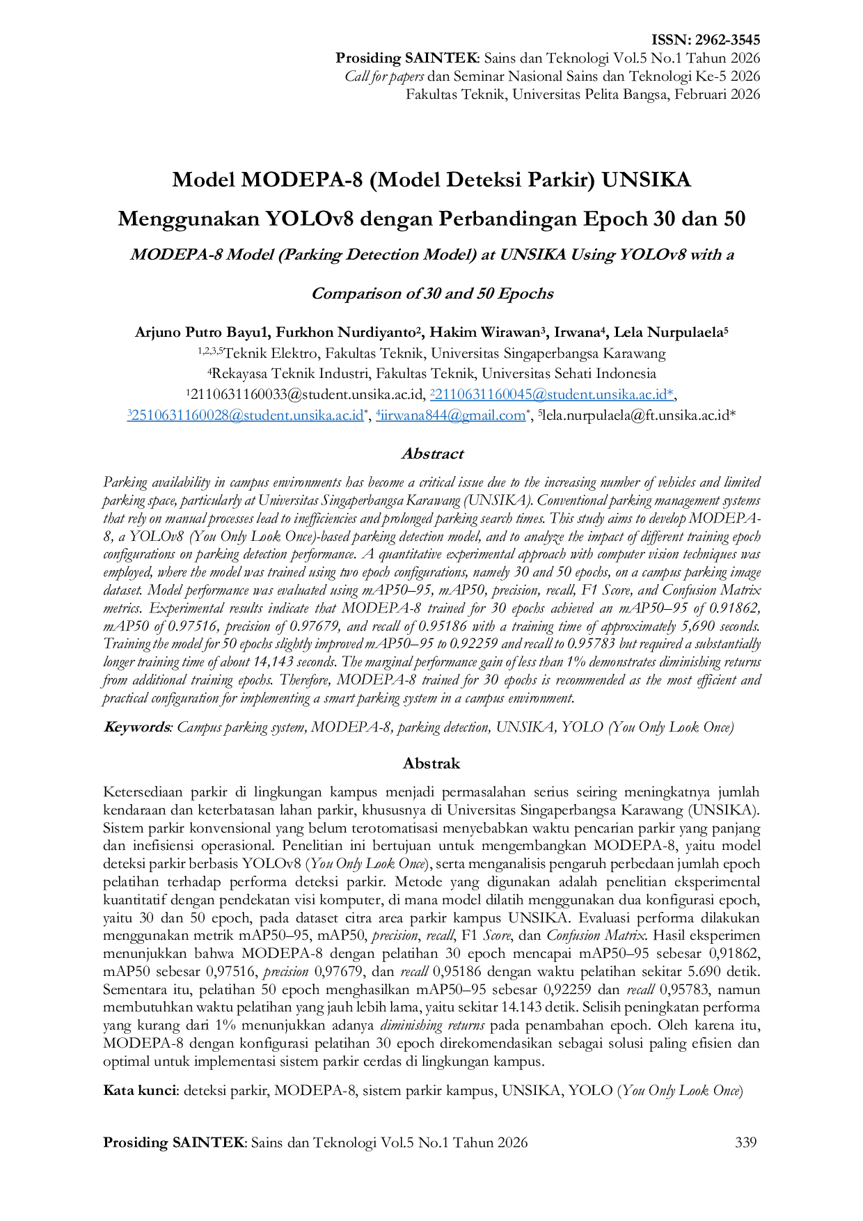 Prosiding Sains dan TeknologiProsiding Sains dan TeknologiKetersediaan parkir di lingkungan kampus menjadi permasalahan serius seiring meningkatnya jumlah kendaraan dan keterbatasan lahan parkir, khususnya di Universitas Singaperbangsa Karawang (UNSIKA). Sistem parkir konvensional yang belum terotomatisasi menyebabkan waktu pencarian parkir yang panjang dan inefisiensi operasional. Penelitian ini bertujuan untuk mengembangkan MODEPA-8, yaitu model deteksi parkir berbasis YOLOv8 (You Only Look Once), serta menganalisis pengaruh perbedaan jumlah epoch pelatihan terhadap performa deteksi parkir. Metode yang digunakan adalah penelitian eksperimental kuantitatif dengan pendekatan visi komputer, di mana model dilatih menggunakan dua konfigurasi epoch, yaitu 30 dan 50 epoch, pada dataset citra area parkir kampus UNSIKA. Evaluasi performa dilakukan menggunakan metrik mAP50–95, mAP50, precision, recall, F1 Score, dan Confusion Matrix. Hasil eksperimen menunjukkan bahwa MODEPA-8 dengan pelatihan 30 epoch mencapai mAP50–95 sebesar 0,91862, mAP50 sebesar 0,97516, precision 0,97679, dan recall 0,95186 dengan waktu pelatihan sekitar 5.690 detik. Sementara itu, pelatihan 50 epoch menghasilkan mAP50–95 sebesar 0,92259 dan recall 0,95783, namun membutuhkan waktu pelatihan yang jauh lebih lama, yaitu sekitar 14.143 detik. Selisih peningkatan performa yang kurang dari 1% menunjukkan adanya diminishing returns pada penambahan epoch. Oleh karena itu, MODEPA-8 dengan konfigurasi pelatihan 30 epoch direkomendasikan sebagai solusi paling efisien dan optimal untuk implementasi sistem parkir cerdas di lingkungan kampus.
