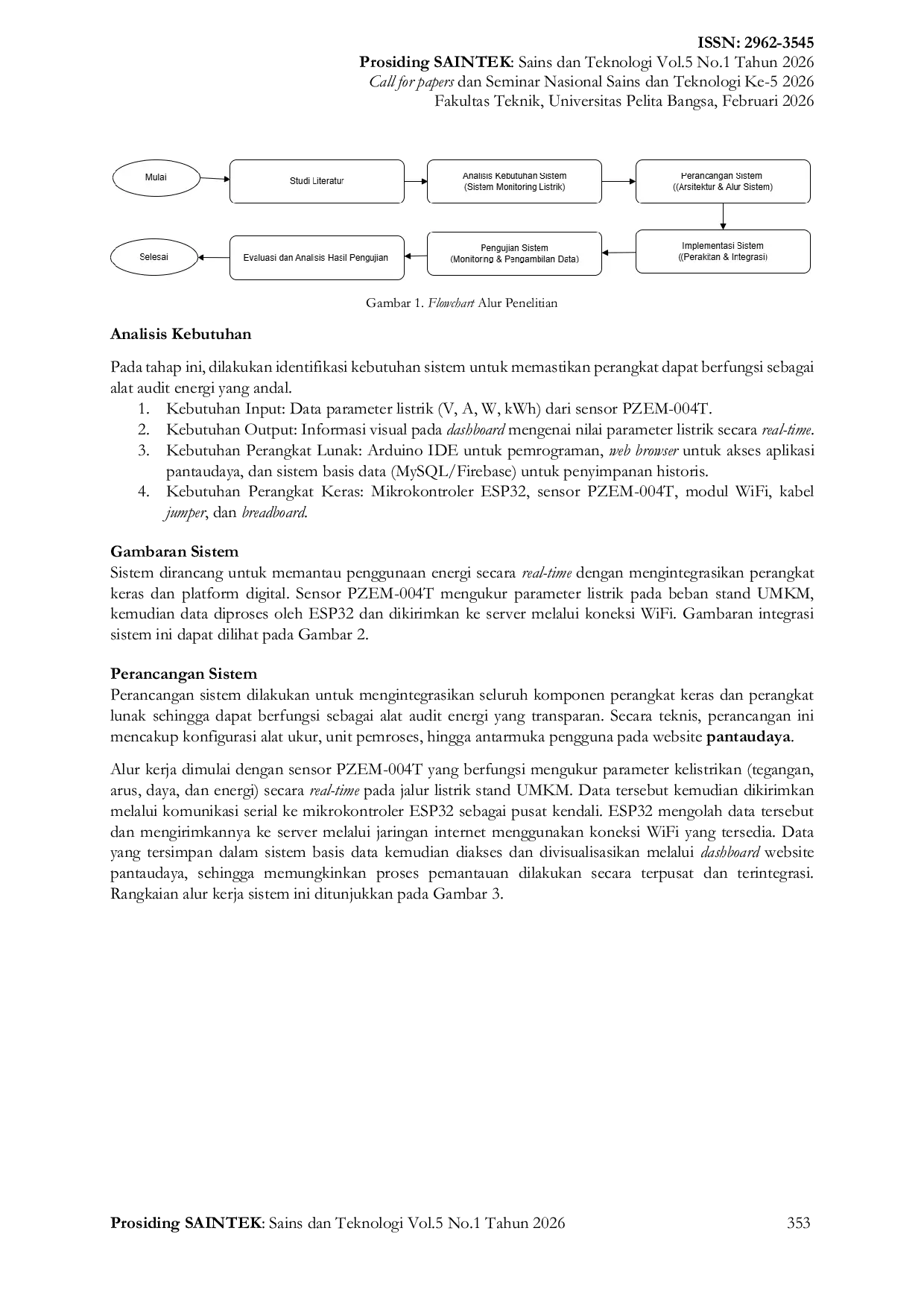 Prosiding Sains dan TeknologiProsiding Sains dan TeknologiSektor Usaha Mikro, Kecil, dan Menengah (UMKM) merupakan pilar penting ekonomi nasional, namun efisiensi operasionalnya seringkali terkendala oleh kurangnya transparansi data penggunaan energi listrik. Tanpa adanya pemantauan secara real-time, pelaku UMKM sulit mengidentifikasi pemborosan energi yang berdampak pada pembengkakan biaya. Penelitian ini bertujuan untuk merancang sistem monitoring energi listrik berbasis Internet of Things (IoT) yang diimplementasikan pada stand UMKM. Sistem ini dibangun menggunakan mikrokontroler ESP32 sebagai otak pemroses data dan sensor PZEM-004T untuk mengukur parameter kelistrikan secara presisi, meliputi tegangan (V), arus (A), daya (W), dan akumulasi konsumsi energi (kWh). Data yang terbaca dikirimkan melalui jaringan internet dan divisualisasikan melalui platform aplikasi website PantauDaya. Melalui platform ini, pelaku UMKM dapat memantau profil konsumsi listrik mereka secara akurat dan berkelanjutan melalui perangkat komputer maupun smartphone. Hasil pengujian menunjukkan bahwa integrasi ESP32 dan PZEM-004T mampu menyediakan data energi yang andal bagi pengguna. Inovasi ini selaras dengan upaya pencapaian Sustainable Development Goals (SDGs) 2030, khususnya poin nomor 7 mengenai energi bersih dan terjangkau serta nomor 12 mengenai konsumsi dan produksi yang bertanggung jawab, melalui digitalisasi manajemen energi di tingkat usaha mikro.