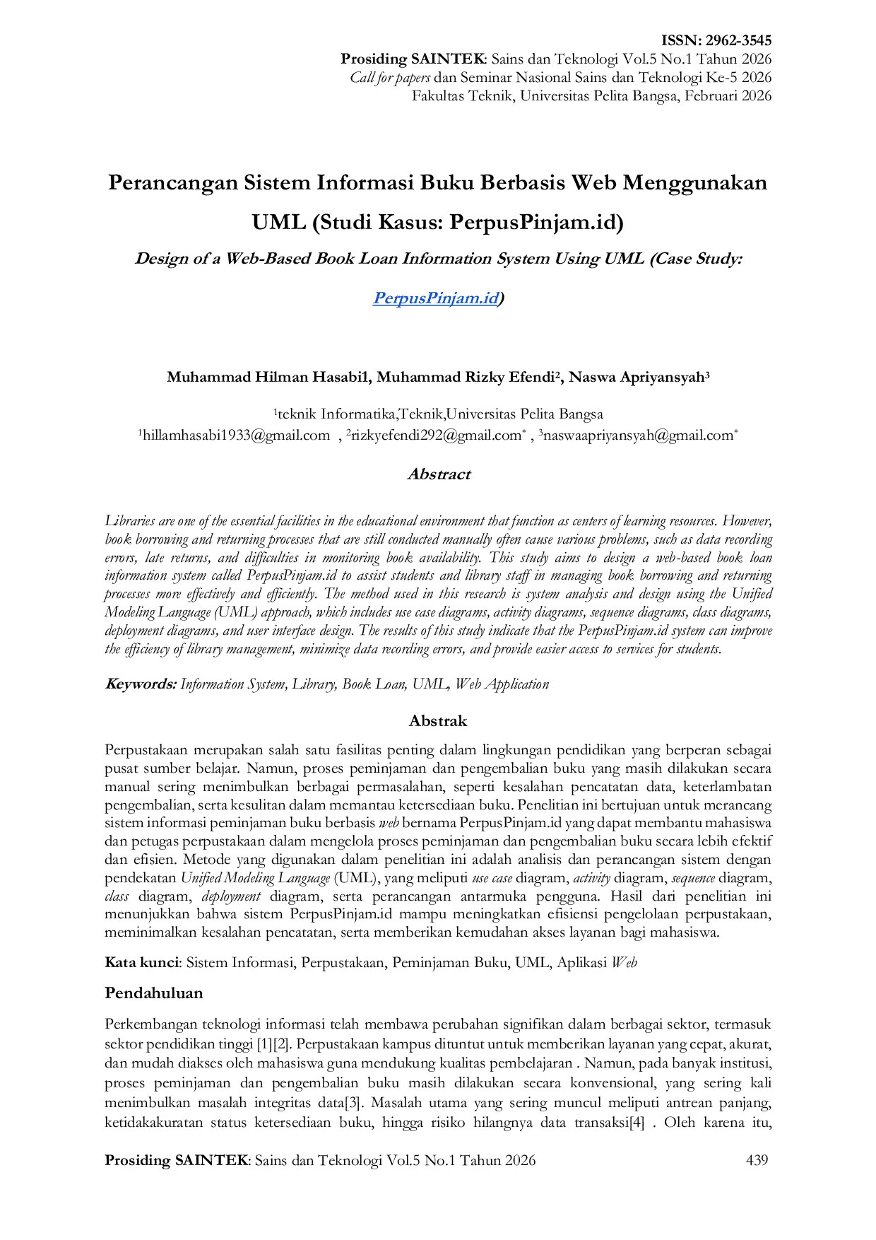 Prosiding Sains dan TeknologiProsiding Sains dan TeknologiPerpustakaan merupakan salah satu fasilitas penting dalam lingkungan pendidikan yang berperan sebagai pusat sumber belajar. Namun, proses peminjaman dan pengembalian buku yang masih dilakukan secara manual sering menimbulkan berbagai permasalahan, seperti kesalahan pencatatan data, keterlambatan pengembalian, serta kesulitan dalam memantau ketersediaan buku. Penelitian ini bertujuan untuk merancang sistem informasi peminjaman buku berbasis web bernama PerpusPinjam.id yang dapat membantu mahasiswa dan petugas perpustakaan dalam mengelola proses peminjaman dan pengembalian buku secara lebih efektif dan efisien. Metode yang digunakan dalam penelitian ini adalah analisis dan perancangan sistem dengan pendekatan Unified Modeling Language (UML), yang meliputi use case diagram, activity diagram, sequence diagram, class diagram, deployment diagram, serta perancangan antarmuka pengguna. Hasil dari penelitian ini menunjukkan bahwa sistem PerpusPinjam.id mampu meningkatkan efisiensi pengelolaan perpustakaan, meminimalkan kesalahan pencatatan, serta memberikan kemudahan akses layanan bagi mahasiswa.