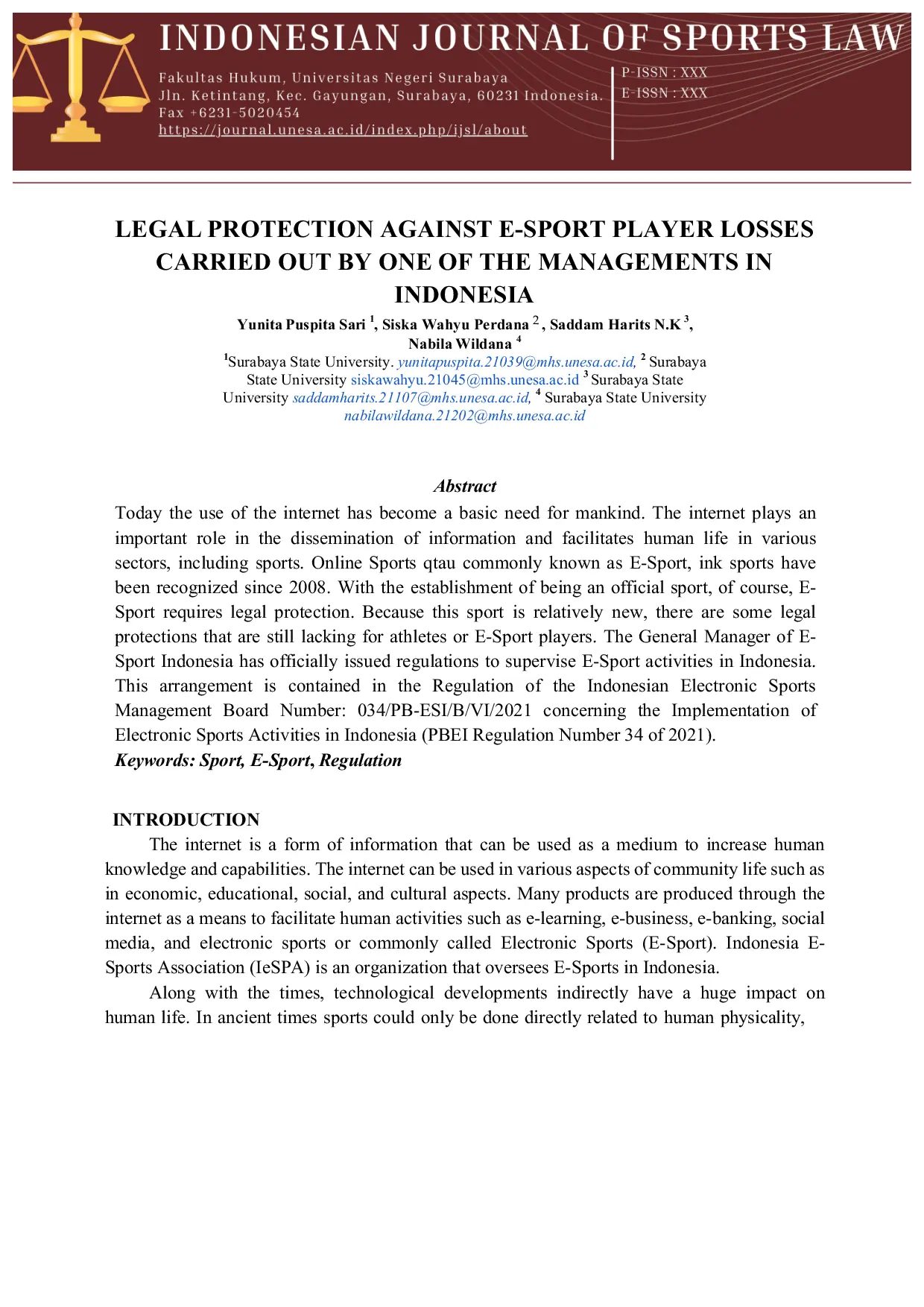 Indonesian Journal of Sports LawIndonesian Journal of Sports LawToday the use of the internet has become a basic need for mankind. The internet plays an important role in the dissemination of information and facilitates human life in various sectors, including sports. Online Sports or commonly known as E-Sport, have been recognized since 2008. With the establishment of being an official sport, of course, E-Sport requires legal protection. Because this sport is relatively new, there are some legal protections that are still lacking for athletes or E-Sport players. The General Manager of E-Sport Indonesia has officially issued regulations to supervise E-Sport activities in Indonesia. This arrangement is contained in the Regulation of the Indonesian Electronic Sports Management Board Number: 034/PB-ESI/B/VI/2021 concerning the Implementation of Electronic Sports Activities in Indonesia (PBEI Regulation Number 34 of 2021).