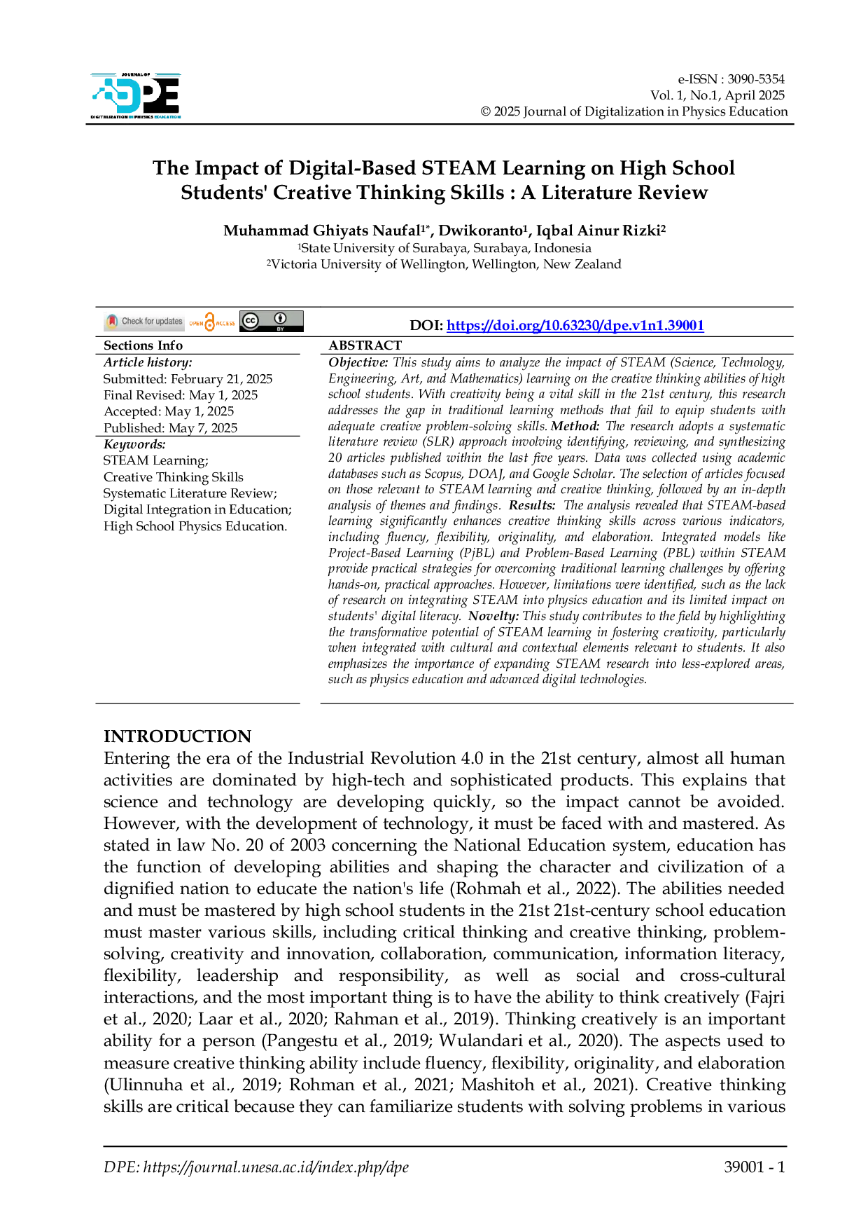 Journal of Digitalization in Physics EducationJournal of Digitalization in Physics EducationTujuan penelitian ini adalah untuk menganalisis dampak pembelajaran STEAM (Science, Technology, Engineering, Art, dan Mathematics) terhadap kemampuan berpikir kreatif siswa SMA. Dengan kreativitas sebagai keterampilan penting di abad ke-21, penelitian ini mengatasi kesenjangan dalam metode pembelajaran konvensional yang gagal membekali siswa dengan keterampilan pemecahan masalah yang kreatif. Metode yang digunakan adalah tinjauan pustaka sistematis (TPS) yang melibatkan identifikasi, peninjauan, dan sintesis 20 artikel yang diterbitkan dalam lima tahun terakhir. Data dikumpulkan menggunakan basis data akademik seperti Scopus, DOAJ, dan Google Scholar. Pemilihan artikel difokuskan pada yang relevan dengan pembelajaran STEAM dan berpikir kreatif, diikuti oleh analisis mendalam terhadap tema dan temuan. Hasil analisis menunjukkan bahwa pembelajaran berbasis STEAM secara signifikan meningkatkan keterampilan berpikir kreatif pada berbagai indikator, termasuk kelancaran, kelenturan, orisinalitas, dan elaborasi. Model terpadu seperti Project-Based Learning (PjBL) dan Problem-Based Learning (PBL) dalam STEAM memberikan strategi praktis untuk mengatasi tantangan pembelajaran konvensional melalui pendekatan langsung. Namun, terdapat keterbatasan, seperti kurangnya penelitian tentang integrasi STEAM dalam pembelajaran fisika dan dampaknya yang terbatas terhadap literasi digital siswa. Kebaruan: Penelitian ini memberikan kontribusi dalam bidang pendidikan dengan menyoroti potensi transformatif pembelajaran STEAM dalam memupuk kreativitas, khususnya ketika diintegrasikan dengan unsur budaya dan konteks setempat. Penelitian ini juga menekankan pentingnya memperluas cakupan penelitian STEAM ke area yang belum banyak dieksplorasi, seperti pendidikan fisika dan pemanfaatan teknologi digital canggih.