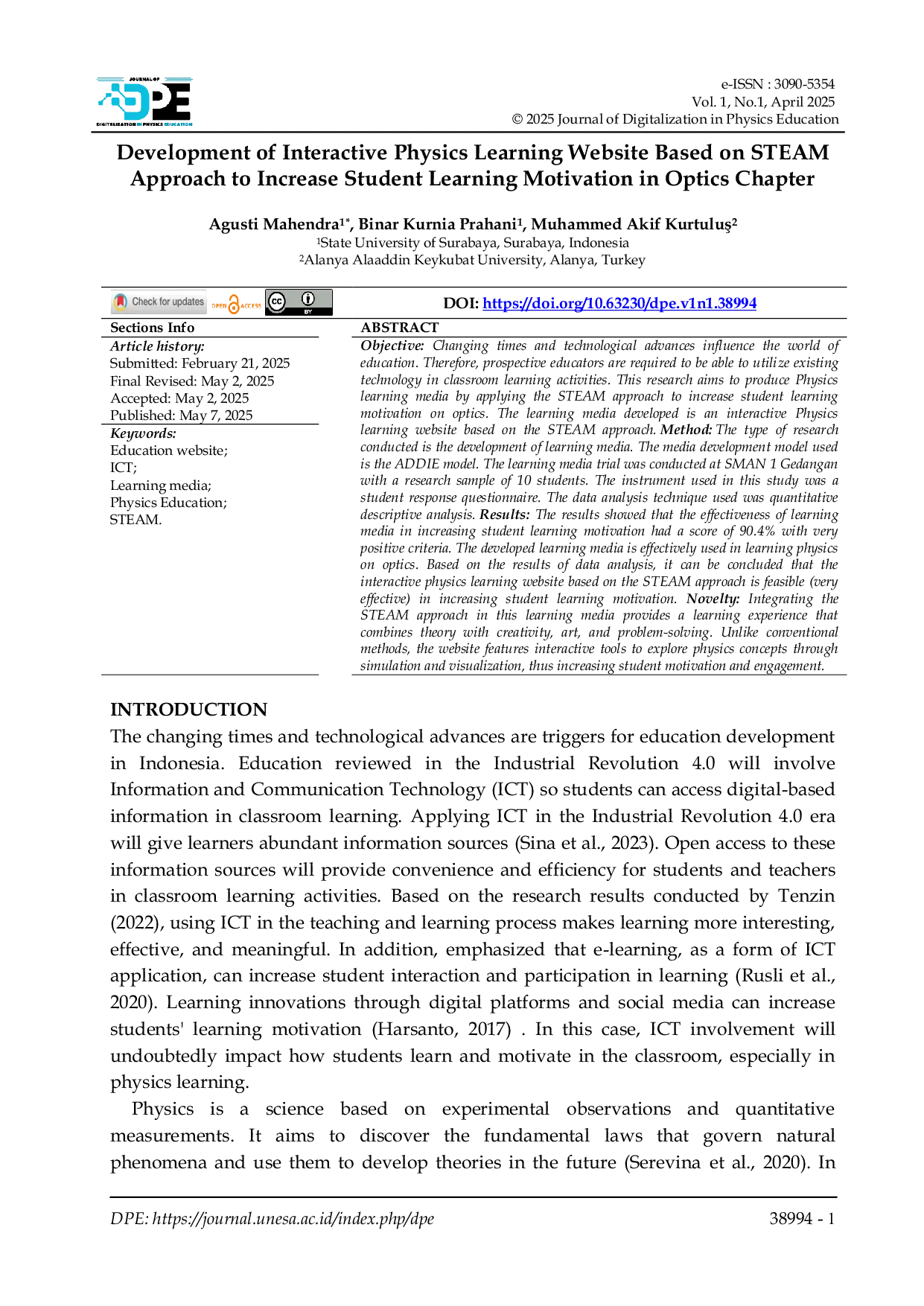 Journal of Digitalization in Physics EducationJournal of Digitalization in Physics EducationTujuan: Perkembangan zaman dan kemajuan teknologi memengaruhi dunia pendidikan. Oleh karena itu, calon pendidik dituntut mampu memanfaatkan teknologi yang ada dalam kegiatan pembelajaran di kelas. Penelitian ini bertujuan menghasilkan media pembelajaran Fisika dengan menerapkan pendekatan STEAM untuk meningkatkan motivasi belajar siswa pada materi optik. Media pembelajaran yang dikembangkan berupa website pembelajaran Fisika interaktif berbasis pendekatan STEAM. Metode: Jenis penelitian yang dilakukan adalah pengembangan media pembelajaran. Model pengembangan media yang digunakan adalah model ADDIE. Uji coba media pembelajaran dilakukan di SMAN 1 Gedangan dengan sampel penelitian sebanyak 10 siswa. Instrumen yang digunakan dalam penelitian ini adalah angket respon siswa. Teknik analisis data yang digunakan adalah analisis deskriptif kuantitatif. Hasil: Hasil menunjukkan bahwa efektivitas media pembelajaran dalam meningkatkan motivasi belajar siswa memperoleh skor 90,4% dengan kriteria sangat positif. Media pembelajaran yang dikembangkan efektif digunakan dalam pembelajaran Fisika materi optik. Berdasarkan hasil analisis data, dapat disimpulkan bahwa website pembelajaran Fisika interaktif berbasis pendekatan STEAM layak (sangat efektif) dalam meningkatkan motivasi belajar siswa. Kebaruan: Integrasi pendekatan STEAM dalam media pembelajaran ini memberikan pengalaman belajar yang menggabungkan teori dengan kreativitas, seni, dan pemecahan masalah. Berbeda dengan metode konvensional, website ini dilengkapi alat interaktif untuk mengeksplorasi konsep Fisika melalui simulasi dan visualisasi, sehingga meningkatkan motivasi dan keterlibatan siswa.