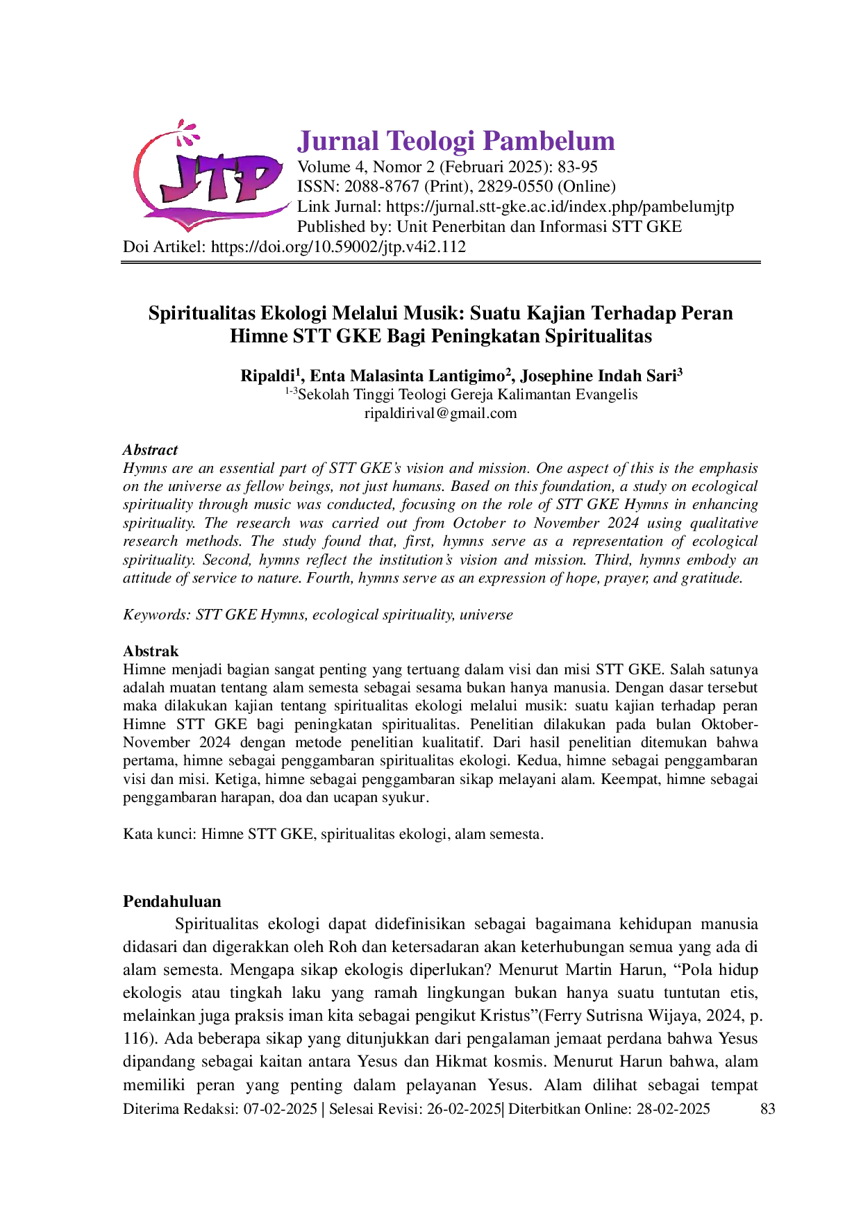 Jurnal Teologi PambelumJurnal Teologi PambelumHimne menjadi bagian sangat penting yang tertuang dalam visi dan misi STT GKE. Salah satunya adalah muatan tentang alam semesta sebagai sesama bukan hanya manusia. Dengan dasar tersebut maka dilakukan kajian tentang spiritualitas ekologi melalui musik: suatu kajian terhadap peran Himne STT GKE bagi peningkatan spiritualitas. Penelitian dilakukan pada bulan Oktober-November 2024 dengan metode penelitian kualitatif. Dari hasil penelitian ditemukan bahwa pertama, himne sebagai penggambaran spiritualitas ekologi. Kedua, himne sebagai penggambaran visi dan misi. Ketiga, himne sebagai penggambaran sikap melayani alam. Keempat, himne sebagai penggambaran harapan, doa dan ucapan syukur.