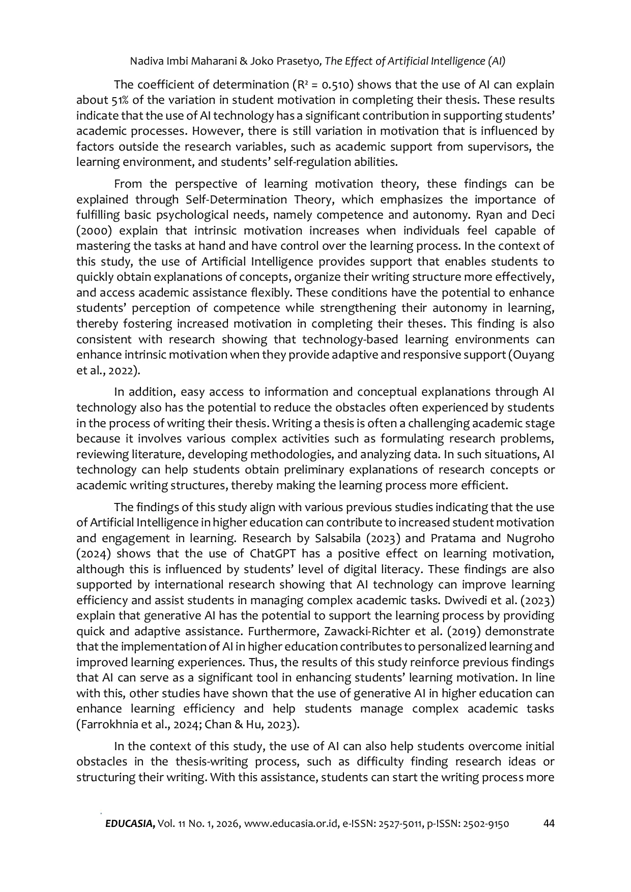 This study demonstrates that the use of Artificial Intelligence has a positive and significant impact on students motivation to complete their theses.These findings suggest that AI technology supports students psychological well-being, enhancing their perceived competence and academic autonomy.However, AI use is not the sole determinant of motivation, as other internal and external factors also play a role.Therefore, the integration of AI should be guided by clear ethical guidelines and a focus on developing students critical thinking skills.