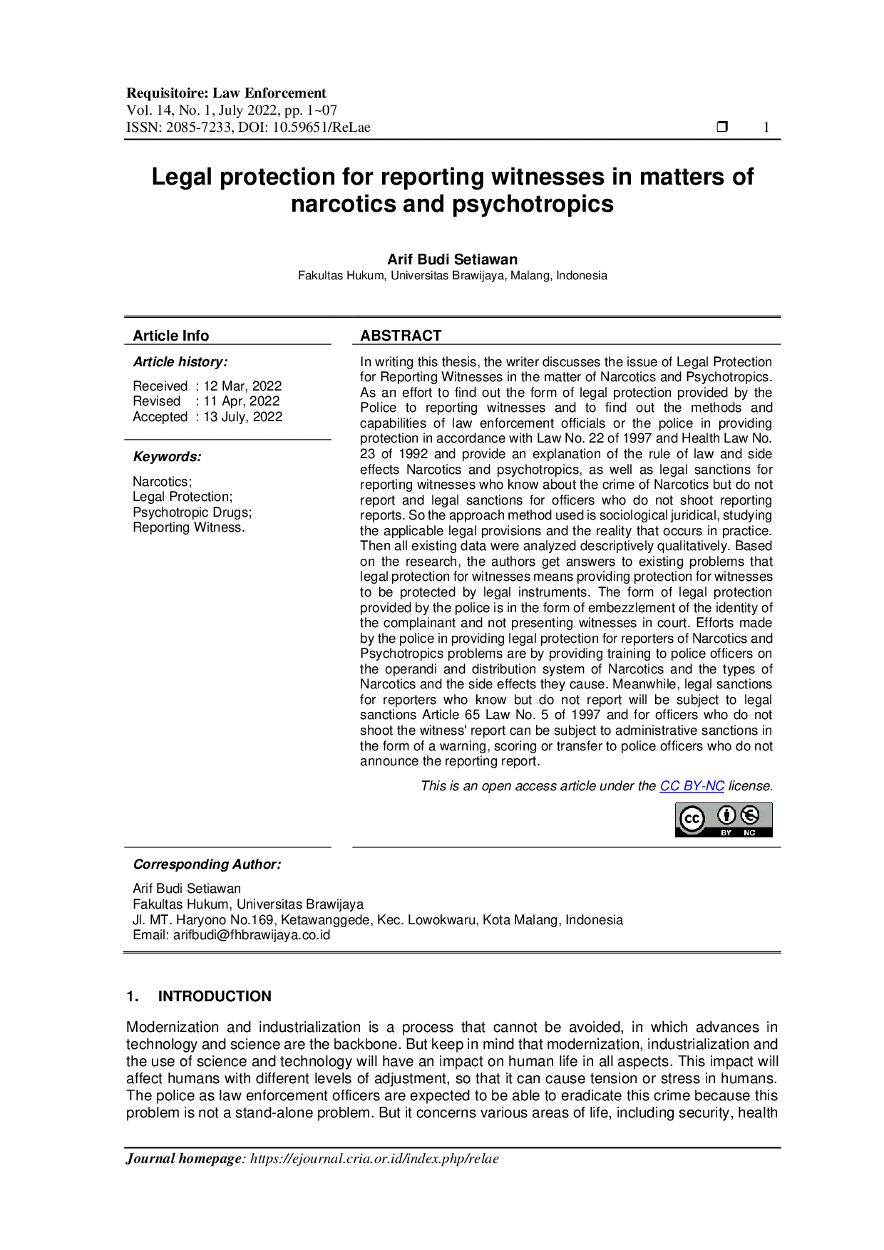 Requisitoire Law EnforcementRequisitoire Law EnforcementDalam penulisan tesis ini, penulis membahas mengenai Perlindungan Hukum untuk Saksi Pelapor dalam hal Narkotika dan Psikotropika. Sebagai upaya untuk mengetahui bentuk perlindungan hukum yang diberikan oleh Kepolisian kepada saksi pelapor dan untuk mengetahui metode dan kemampuan penegak hukum atau Kepolisian dalam memberikan perlindungan sesuai dengan Undang-Undang Nomor 22 Tahun 1997 dan Undang-Undang Kesehatan Nomor 23 Tahun 1992 serta memberikan penjelasan mengenai aturan hukum dan efek samping Narkotika dan psikotropika, serta sanksi hukum bagi saksi pelapor yang mengetahui tentang tindak pidana Narkotika tetapi tidak melapor dan sanksi hukum bagi petugas yang tidak menindaklanjuti laporan saksi. Sehingga metode pendekatan yang digunakan adalah yuridis sosiologis, yaitu mempelajari ketentuan hukum yang berlaku dan realitas yang terjadi dalam praktik. Kemudian semua data yang ada dianalisis secara deskriptif kualitatif. Berdasarkan penelitian, penulis mendapatkan jawaban atas permasalahan yang ada bahwa perlindungan hukum bagi saksi berarti memberikan perlindungan bagi saksi agar terlindungi oleh instrumen hukum. Bentuk perlindungan hukum yang diberikan oleh Kepolisian adalah dalam bentuk pengaburan identitas pelapor dan tidak menampilkan saksi di persidangan. Upaya yang dilakukan oleh Kepolisian dalam memberikan perlindungan hukum bagi pelapor masalah Narkotika dan Psikotropika adalah dengan memberikan pelatihan kepada petugas Kepolisian mengenai operandi dan sistem peredaran Narkotika serta jenis-jenis Narkotika dan efek samping yang ditimbulkannya. Sedangkan sanksi hukum bagi pelapor yang mengetahui tetapi tidak melapor akan dikenakan sanksi hukum Pasal 65 Undang-Undang Nomor 5 Tahun 1997 dan bagi petugas yang tidak menindaklanjuti laporan saksi dapat dikenakan sanksi administratif berupa peringatan, penilaian atau pemindahan kepada petugas Kepolisian yang tidak mengumumkan laporan saksi.