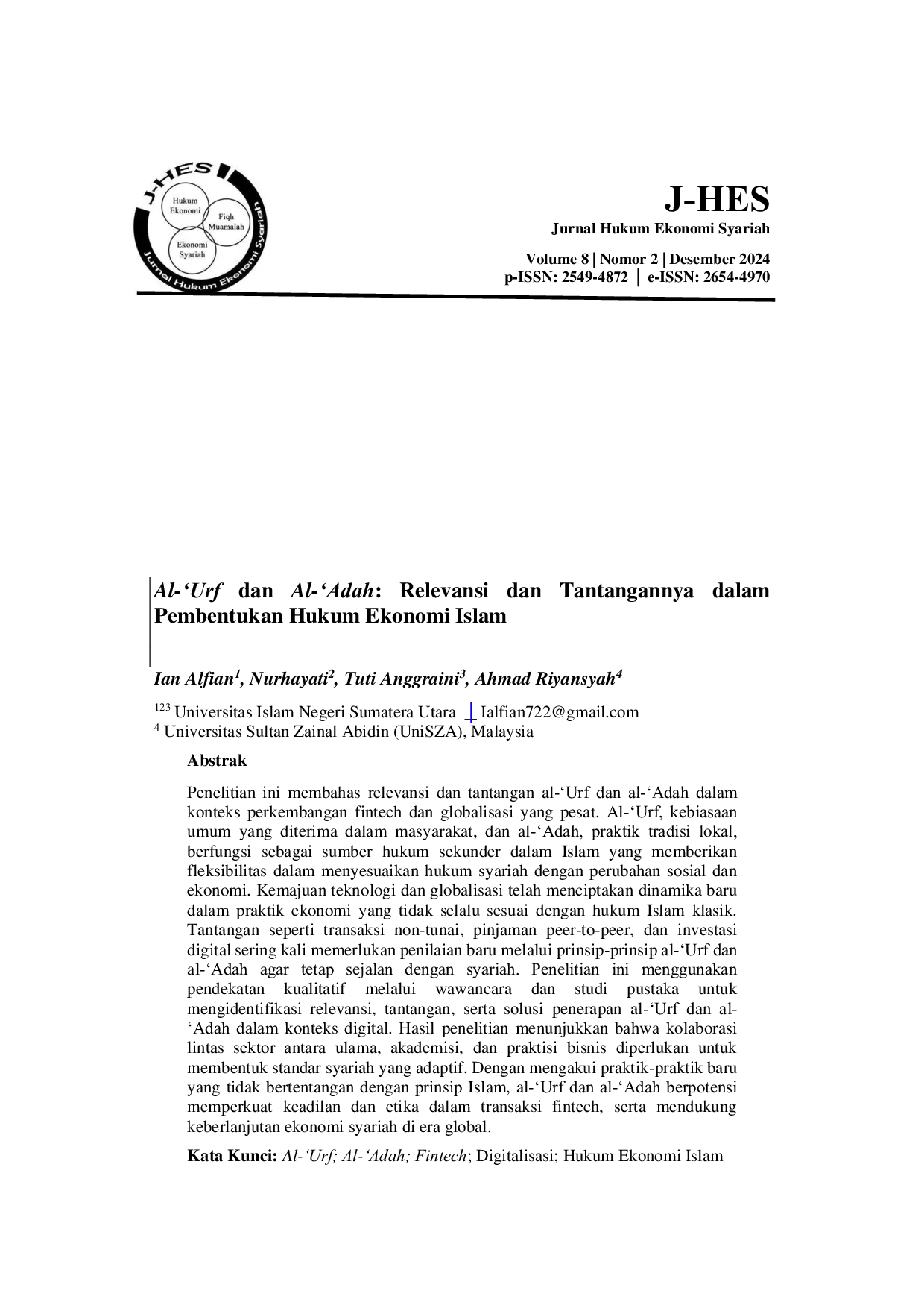 Jurnal Hukum Ekonomi SyariahJurnal Hukum Ekonomi SyariahPenelitian ini membahas relevansi dan tantangan al-Urf dan al-Adah dalam konteks perkembangan fintech dan globalisasi yang pesat. Al-Urf, kebiasaan umum yang diterima dalam masyarakat, dan al-Adah, praktik tradisi lokal, berfungsi sebagai sumber hukum sekunder dalam Islam yang memberikan fleksibilitas dalam menyesuaikan hukum syariah dengan perubahan sosial dan ekonomi. Kemajuan teknologi dan globalisasi telah menciptakan dinamika baru dalam praktik ekonomi yang tidak selalu sesuai dengan hukum Islam klasik. Tantangan seperti transaksi non-tunai, pinjaman peer-to-peer, dan investasi digital sering kali memerlukan penilaian baru melalui prinsip-prinsip al-Urf dan al-Adah agar tetap sejalan dengan syariah. Penelitian ini menggunakan pendekatan kualitatif melalui wawancara dan studi pustaka untuk mengidentifikasi relevansi, tantangan, serta solusi penerapan al-Urf dan al-Adah dalam konteks digital. Hasil penelitian menunjukkan bahwa kolaborasi lintas sektor antara ulama, akademisi, dan praktisi bisnis diperlukan untuk membentuk standar syariah yang adaptif. Dengan mengakui praktik-praktik baru yang tidak bertentangan dengan prinsip Islam, al-Urf dan al-Adah berpotensi memperkuat keadilan dan etika dalam transaksi fintech, serta mendukung keberlanjutan ekonomi syariah di era global.