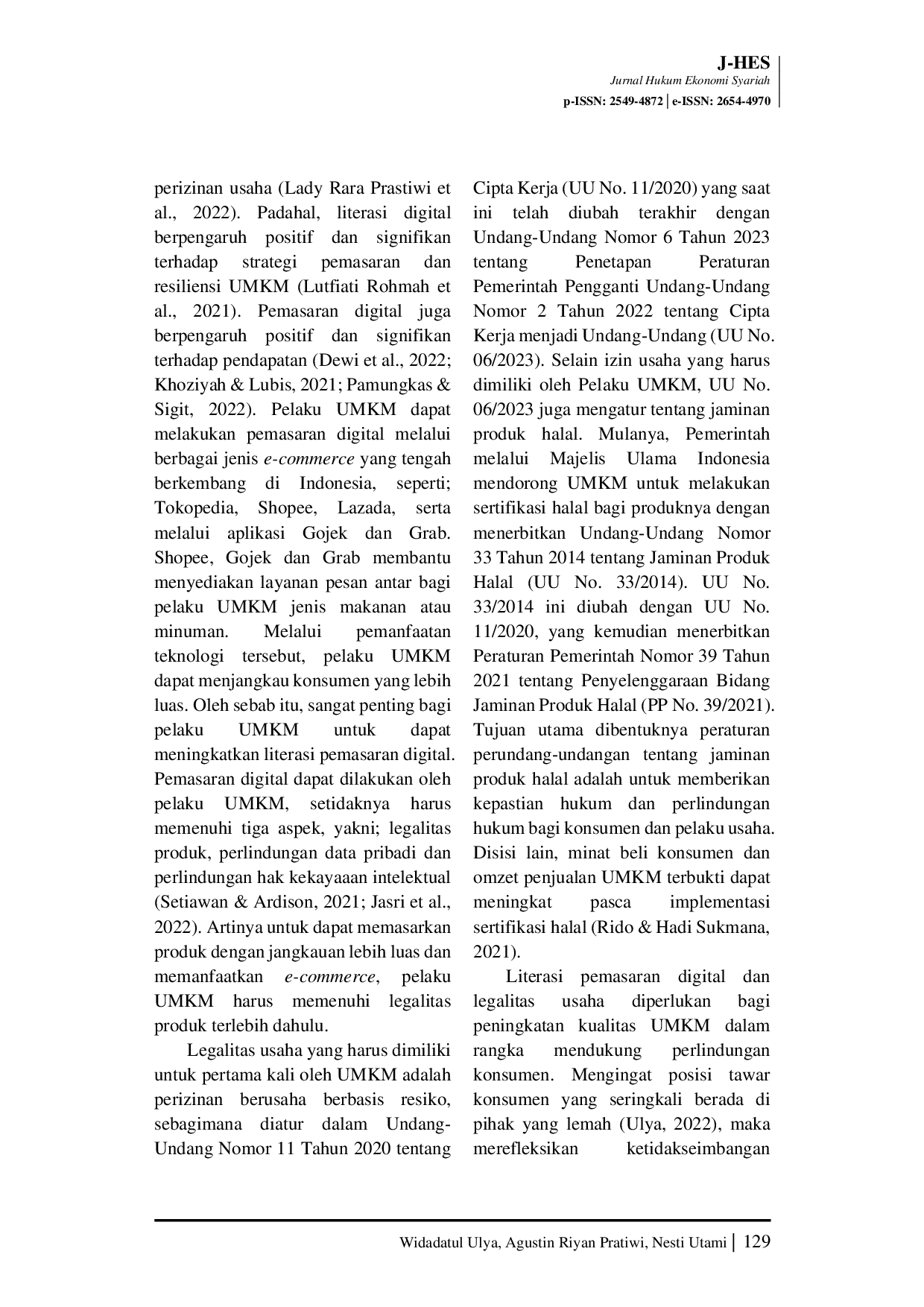 Jurnal Hukum Ekonomi SyariahJurnal Hukum Ekonomi SyariahIndustri Usaha Mikro Kecil Menengah sering berhadapan dengan masalah penerapan teknologi, pemasaran dan legalitas atau perizinan usaha. Di era teknologi saat ini, UMKM seharusnya mampu menerapkan pemasaran berbasis digital, dan memenuhi legalitas produknya dalam rangka melindungi hak dan kewajiban konsumen, sebagaimana diamanahkan dalam peraturan perundang‑undangan. Problematika tersebut melatarbelakangi perlunya dilaksanakan kajian yang mendalam, sehingga tujuan peneliti yaitu melakukan analisis terhadap pengaruh literasi pemasaran digital dan legalitas produk terhadap kepatuhan implementasi perlindungan berusaha serta kepatuhan berusaha konsumen. Metode Structural Equation Modeling (SEM) digunakan dalam penelitian explanatory research ini dan diperkuat dengan analisis kuantitatif dan teknik purposive sampling agar mendapatkan hasil yang reliabel. Hasil penelitian dapat disimpulkan bahwa literasi pemasaran digital dan legalitas produk berpengaruh signifikan terhadap kepatuhan berusaha. Selanjutnya, kepatuhan berusaha berpengaruh signifikan terhadap perlindungan konsumen. Hal ini dapat diartikan bahwa perlindungan hukum bagi konsumen UMKM dapat diimplementasikan melalui peningkatan literasi pemasaran digital dan legalitas produk UMKM, karena literasi pemasaran digital dan legalitas produk berpengaruh terhadap kepatuhan berusaha pelaku UMKM.