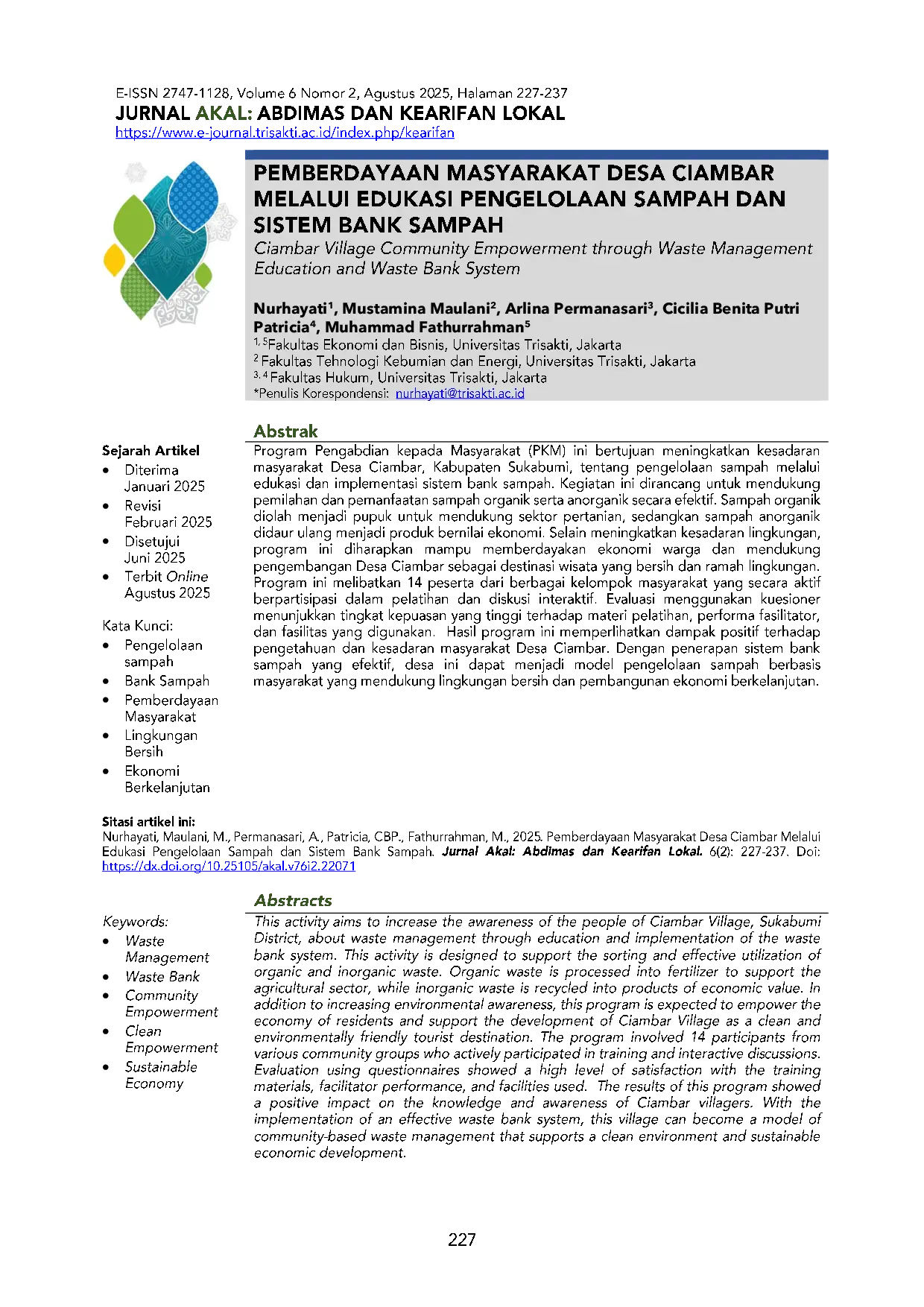 Jurnal AKAL: Abdimas dan Kearifan LokalJurnal AKAL: Abdimas dan Kearifan LokalProgram Pengabdian kepada Masyarakat (PKM) ini bertujuan meningkatkan kesadaran masyarakat Desa Ciambar, Kabupaten Sukabumi, tentang pengelolaan sampah melalui edukasi dan implementasi sistem bank sampah. Kegiatan ini dirancang untuk mendukung pemilahan dan pemanfaatan sampah organik serta anorganik secara efektif. Sampah organik diolah menjadi pupuk untuk mendukung sektor pertanian, sedangkan sampah anorganik didaur ulang menjadi produk bernilai ekonomi. Selain meningkatkan kesadaran lingkungan, program ini diharapkan mampu memberdayakan ekonomi warga dan mendukung pengembangan Desa Ciambar sebagai destinasi wisata yang bersih dan ramah lingkungan. Program ini melibatkan 14 peserta dari berbagai kelompok masyarakat yang berpartisipasi dalam pelatihan dan diskusi interaktif. Evaluasi menggunakan kuesioner menunjukkan tingkat kepuasan yang tinggi terhadap materi pelatihan, performa fasilitator, dan fasilitas yang digunakan. Hasil program ini memperlihatkan dampak positif terhadap pengetahuan dan kesadaran masyarakat Desa Ciambar. Dengan penerapan sistem bank sampah yang efektif, desa ini dapat menjadi model pengelolaan sampah berbasis masyarakat yang mendukung lingkungan bersih dan pembangunan ekonomi berkelanjutan.