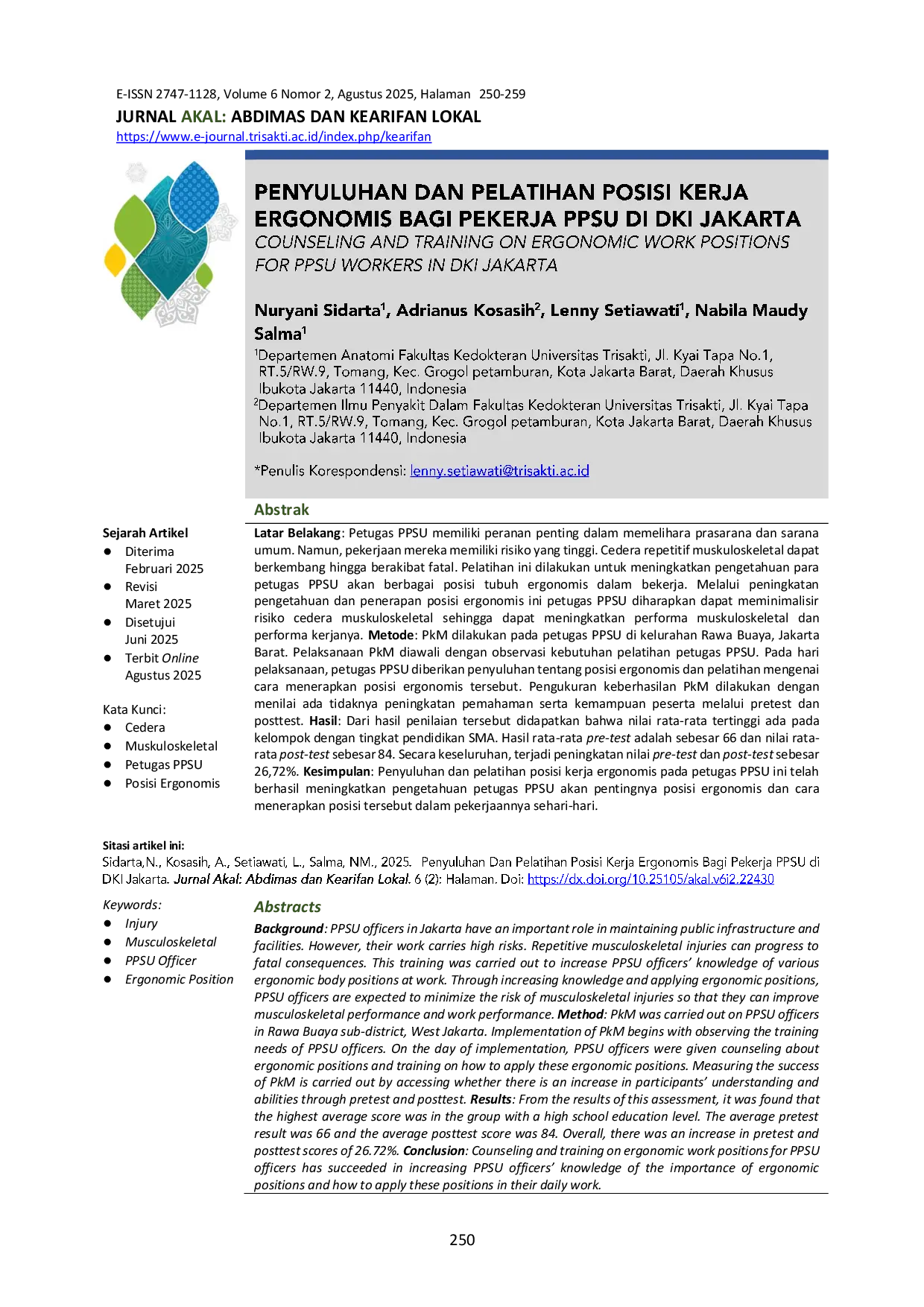 Jurnal AKAL: Abdimas dan Kearifan LokalJurnal AKAL: Abdimas dan Kearifan LokalLatar Belakang: Petugas PPSU memiliki peranan penting dalam memelihara prasarana dan sarana umum. Namun, pekerjaan mereka memiliki risiko yang tinggi. Cedera repetitif muskuloskeletal dapat berkembang hingga berakibat fatal. Pelatihan ini dilakukan untuk meningkatkan pengetahuan para petugas PPSU akan berbagai posisi tubuh ergonomis dalam bekerja. Melalui peningkatan pengetahuan dan penerapan posisi ergonomis ini petugas PPSU diharapkan dapat meminimalisir risiko cedera muskuloskeletal sehingga dapat meningkatkan performa muskuloskeletal dan performa kerjanya. Metode: PkM dilakukan pada petugas PPSU di kelurahan Rawa Buaya, Jakarta Barat. Pelaksanaan PkM diawali dengan observasi kebutuhan pelatihan petugas PPSU. Pada hari pelaksanaan, petugas PPSU diberikan penyuluhan tentang posisi ergonomis dan pelatihan mengenai cara menerapkan posisi ergonomis tersebut. Pengukuran keberhasilan PkM dilakukan dengan menilai ada tidaknya peningkatan pemahaman serta kemampuan peserta melalui pretest dan posttest. Hasil: Dari hasil penilaian tersebut didapatkan bahwa nilai rata-rata tertinggi ada pada kelompok dengan tingkat pendidikan SMA. Hasil rata-rata pre-test adalah sebesar 66 dan nilai rata-rata post-test sebesar 84. Secara keseluruhan, terjadi peningkatan nilai pre-test dan post-test sebesar 26,72%.