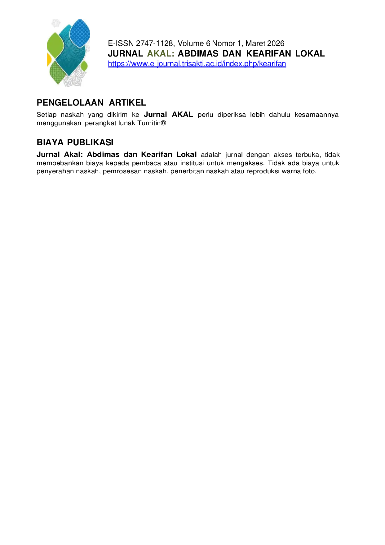 Jurnal AKAL: Abdimas dan Kearifan LokalJurnal AKAL: Abdimas dan Kearifan LokalJurnal AKAL: Abdimas dan Kearifan Lokal adalah jurnal ilmiah yang mempublikasikan hasil kegiatan pengabdian dan pemberdayaan masyarakat, berisi berbagai kegiatan penanganan dan pengelolaan berbagai potensi dan masalah yang ada di masyarakat. Pelaksanaan kegiatan pengabdian tersebut melibatkan partisipasi masyarakat dan mitra yang bertujuan untuk memberdayakan masyarakat, mengangkat potensi kearifan lokal yang pada akhirnya dapat meningkatkan kesejahteraan masyarakat. Tujuan dari publikasi kegiatan pengabdian kepada masyarakat ini adalah untuk menyebarluaskan pemikiran konseptual teoritis dan ide-ide realistis yang telah dilaksanakan dalam kegiatan pengabdian kepada masyarakat untuk menjadi masukan bagi pengembangan kegiatan penelitian dan kegiatan pengabdian masyarakat lebih lanjut.