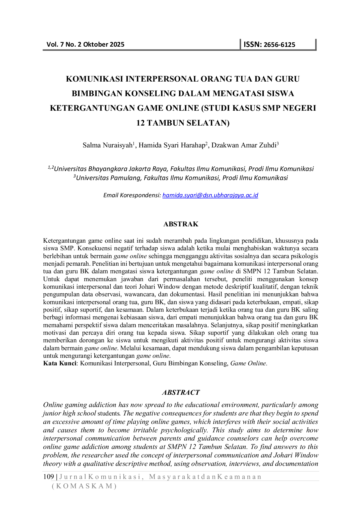 Jurnal Komunikasi, Masyarakat dan KeamananJurnal Komunikasi, Masyarakat dan KeamananKetergantungan game online saat ini menjadi permasalahan yang merambah lingkungan pendidikan, khususnya pada siswa SMP. Penelitian ini bertujuan untuk mengetahui bagaimana komunikasi interpersonal orang tua dan guru BK dalam mengatasi siswa ketergantungan game online di SMPN 12 Tambun Selatan. Penelitian ini menggunakan konsep komunikasi interpersonal dan teori Johari Window dengan metode deskriptif kualitatif. Hasil penelitian menunjukkan bahwa komunikasi interpersonal orang tua, guru BK, dan siswa didasari pada keterbukaan, empati, sikap positif, sikap suportif, dan kesamaan. Melalui komunikasi yang efektif, siswa dapat didukung dalam mengurangi ketergantungan game online.