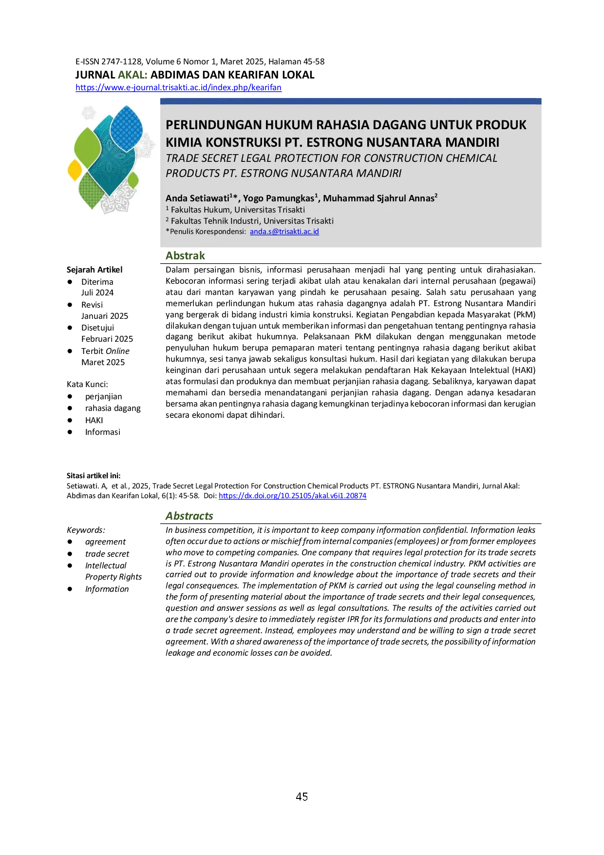 Jurnal AKAL: Abdimas dan Kearifan LokalJurnal AKAL: Abdimas dan Kearifan LokalDalam persaingan bisnis, informasi perusahaan menjadi hal yang penting untuk dirahasiakan. Kebocoran informasi sering terjadi akibat ulah atau kenakalan dari internal perusahaan (pegawai) atau dari mantan karyawan yang pindah ke perusahaan pesaing. Salah satu perusahaan yang memerlukan perlindungan hukum atas rahasia dagangnya adalah PT. Estrong Nusantara Mandiri yang bergerak di bidang industri kimia konstruksi. Kegiatan Pengabdian kepada Masyarakat (PkM) dilakukan dengan tujuan untuk memberikan informasi dan pengetahuan tentang pentingnya rahasia dagang berikut akibat hukumnya. Pelaksanaan PkM dilakukan dengan menggunakan metode penyuluhan hukum berupa pemaparan materi tentang pentingnya rahasia dagang berikut akibat hukumnya, sesi tanya jawab sekaligus konsultasi hukum. Hasil dari kegiatan yang dilakukan berupa keinginan dari perusahaan untuk segera melakukan pendaftaran Hak Kekayaan Intelektual (HAKI) atas formulasi dan produknya dan membuat perjanjian rahasia dagang. Sebaliknya, karyawan dapat memahami dan bersedia menandatangani perjanjian rahasia dagang. Dengan adanya kesadaran bersama akan pentingnya rahasia dagang kemungkinan terjadinya kebocoran informasi dan kerugian secara ekonomi dapat dihindari.