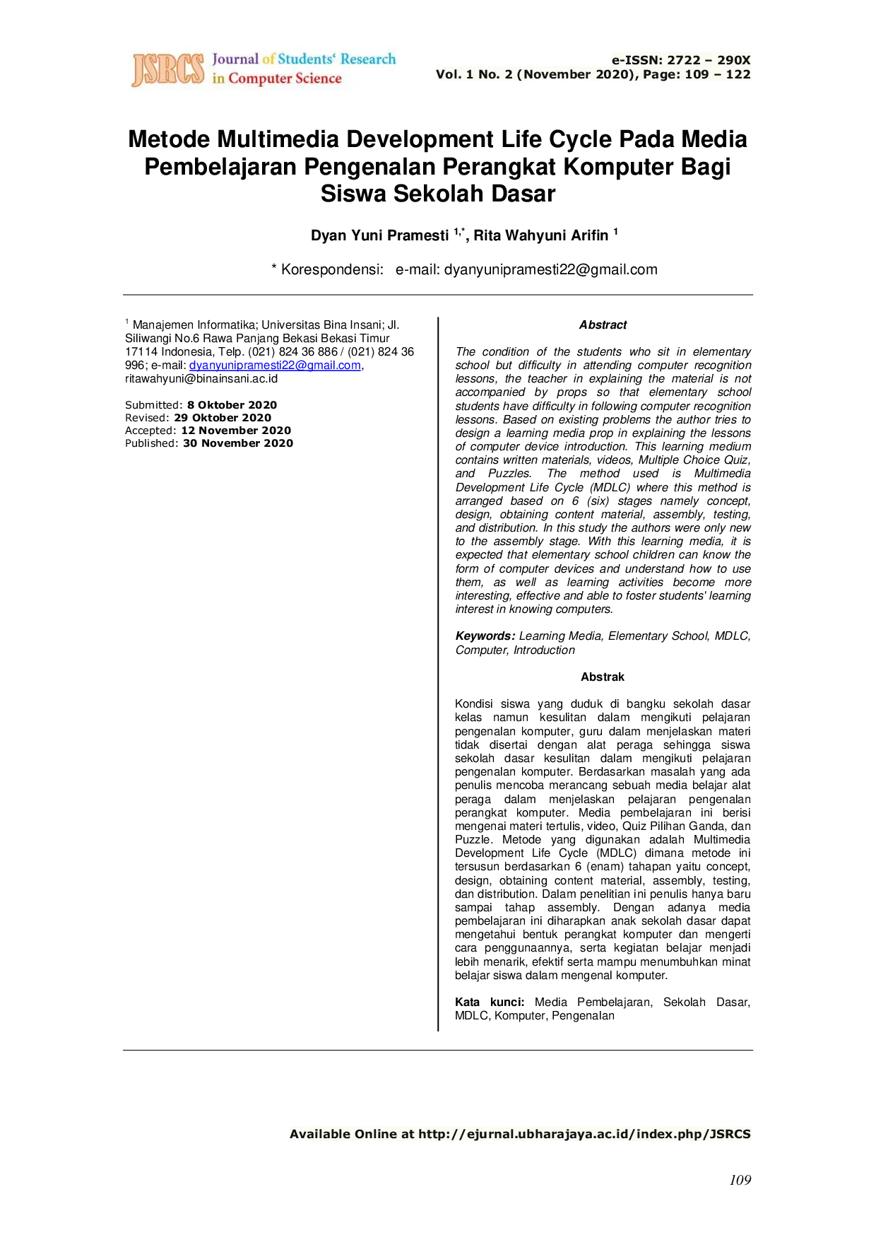 Journal of Students‘ Research in Computer ScienceJournal of Students‘ Research in Computer ScienceKondisi siswa yang duduk di bangku sekolah dasar kelas namun kesulitan dalam mengikuti pelajaran pengenalan komputer, guru dalam menjelaskan materi tidak disertai dengan alat peraga sehingga siswa sekolah dasar kesulitan dalam mengikuti pelajaran pengenalan komputer. Berdasarkan masalah yang ada penulis mencoba merancang sebuah media belajar alat peraga dalam menjelaskan pelajaran pengenalan perangkat komputer. Media pembelajaran ini berisi mengenai materi tertulis, video, Quiz Pilihan Ganda, dan Puzzle. Metode yang digunakan adalah Multimedia Development Life Cycle (MDLC) dimana metode ini tersusun berdasarkan 6 (enam) tahapan yaitu concept, design, obtaining content material, assembly, testing, dan distribution. Dalam penelitian ini penulis hanya baru sampai tahap assembly. Dengan adanya media pembelajaran ini diharapkan anak sekolah dasar dapat mengetahui bentuk perangkat komputer dan mengerti cara penggunaannya, serta kegiatan belajar menjadi lebih menarik, efektif serta mampu menumbuhkan minat belajar siswa dalam mengenal komputer.