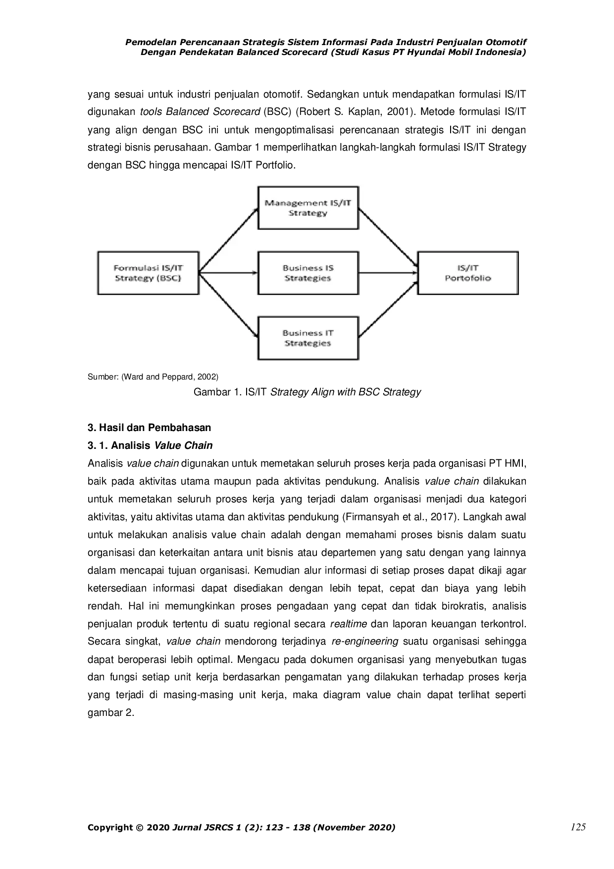 Journal of Students‘ Research in Computer ScienceJournal of Students‘ Research in Computer ScienceIndustri dan bisnis penjualan otomotif merupakan bisnis yang memiliki kontribusi besar terhadap pertumbuhan ekonomi di negeri ini. Persaingan pada bisnis penjualan otomotif juga makin tinggi sehingga membutuhkan kebutuhan strategi bisnis yang tepat untuk bertahan dan tumbuh berkembang. Sebagian besar bisnis otomotif ini telah memanfaatkan Teknologi Informasi (TI) untuk menunjang operasionalnya. Namun kemampuan dalam perencanaan, pengelolaan serta implementasi Sistem Informasi dan Teknologi (SI/TI) yang dihubungkan dengan strategi bisnis perusahaan masih belum diterapkan sepenuhnya. Untuk itu Perencanaan Strategis Sistem Informasi saat ini merupakan salah satu kunci dalam pencapaian sasaran perusahaan yang harus diselaraskan dengan strategi bisnis yang ditetapkan oleh perusahaan. Peranan SI/TI yang ada sebaiknya tidak hanya sebagai alat otomasi operasional namun lebih dari itu sebagai key enabler organisasi. Kajian yang dilakukan untuk pemodelan rencana strategi SI/TI berdasar strategi bisnis Hyundai dengan menggunakan metodologi Ward & Peppard, analisis dengan SWOT, Value Chain, Five Force yang kemudian dipetakan ke dalam Critical Succes Factor untuk mendapatkan strategi-strategi SI/TI yang memungkinkan.