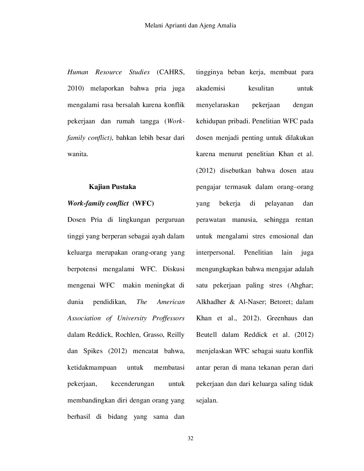 Jurnal ProvitaeJurnal ProvitaeMemenuhi tuntutan berbagai peran yang diemban sebagai ayah yang baik, sebagai pencari nafkah, dan memiliki peran dalam keluarga, dapat menjadi tekanan ketika terjadi inkonsistensi dan konflik antar peran tersebut. Konflik semacam itu disebut Work-Family Conflict (WFC). Mengingat pentingnya keselarasan antara pekerjaan dengan keluarga, penelitian ini bertujuan untuk mendapatkan gambaran mengenai bentuk konflik antara pekerjaan dengan keluarga pada dosen pria serta strategi yang mereka lakukan untuk mengatasi konflik tersebut. Pemilihan dua subjek berusia 22 hingga 52 tahun dalam penelitian ini didasarkan pada hasil penelitian yang dilakukan oleh Families and Work Institute (Lamanna, Riedman, dan Strahm, 2012) yang menyatakan bahwa pria kelahiran antara tahun 1965 dan 1994 sebagian besar memiliki pandangan bahwa keluarga itu penting (family-centric). Untuk mendapatkan pemahaman yang lengkap dan menyeluruh mengenai pengalaman subjek, penelitian ini menggunakan desain studi kualitatif. Studi ini mengungkapkan bahwa sebagai dosen, kedua subjek mengalami konflik di mana keluarga mengganggu pekerjaan dan pekerjaan mengganggu keluarga. Bentuk konflik dominan yang mereka alami sebagai dosen adalah konflik berbasis ketegangan (Strain-based conflict) dan konflik berbasis waktu (Time-Based Conflict). Sebagian besar konflik dialami oleh subjek yang istrinya merupakan ibu rumah tangga, di mana istri tidak dapat sepenuhnya memahami situasi pekerjaan suami. Strategi koping yang digunakan subjek mencakup semua bentuk koping berfokus masalah (problem-focused coping) dan koping berfokus emosi (emotion-focused coping), kecuali strategi koping penyangkalan (denial) karena semua subjek mengakui dan terus memikirkan konflik tersebut.