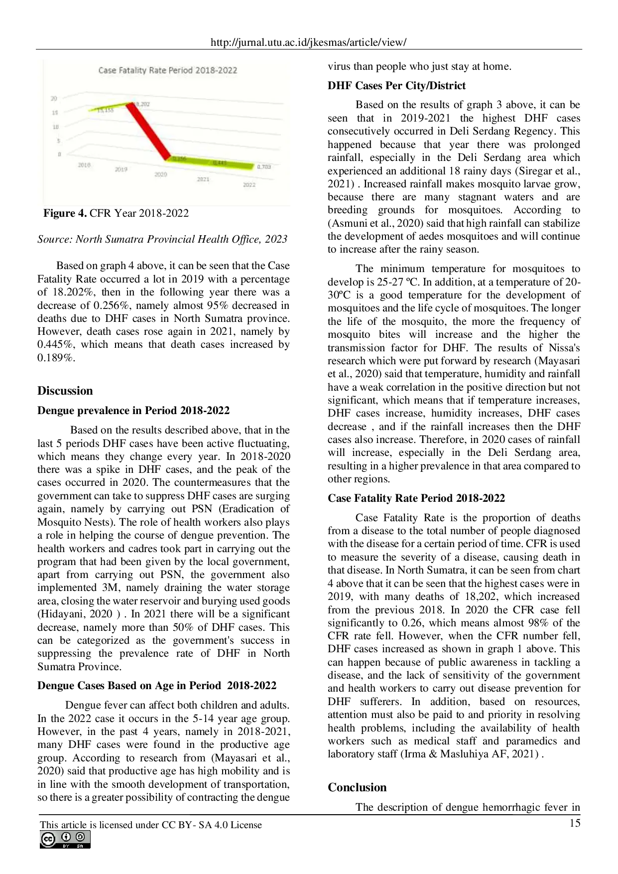 J-Kesmas: Jurnal Fakultas Kesehatan Masyarakat (The Indonesian Journal of Public Health)J-Kesmas: Jurnal Fakultas Kesehatan Masyarakat (The Indonesian Journal of Public Health)Demam Berdarah Dengue (DBD) adalah penyakit yang disebabkan oleh virus dengue, diidentifikasi dengan munculnya demam selama 2 hingga 7 hari. Penyakit ini termasuk dalam kelas Arthropod-Borne Virus, genus Flavivirus, dan famili Flaviviridae. Infeksi dengue merupakan penyakit menular yang berpotensi menjadi wabah (kejadian luar biasa). Selain itu, penyakit ini juga dapat disebabkan oleh faktor lingkungan dan perilaku masyarakat, yang ditularkan melalui gigitan nyamuk Aedes aegypti dan Aedes albopictus. Penelitian ini menggunakan metode deskriptif dan data sekunder. Pada periode 2018-2022, puncak kasus DBD tertinggi terjadi pada tahun 2020, yang disebabkan oleh curah hujan tinggi dan kelembaban tinggi sehingga perkembangan nyamuk menjadi lebih pesat. Dari beberapa kabupaten/kota, tingkat prevalensi lebih tinggi di Kabupaten Deli Serdang dan Kota Medan. Angka CFR meningkat pada tahun 2019 dibandingkan tahun 2018. Gambaran demam berdarah dengue dalam 5 tahun terakhir di Provinsi Sumatera Utara pada periode 2018-2022 menunjukkan fluktuasi. Terlihat bahwa pada tahun 2020 puncak kasus DBD ditemukan di Sumatera Utara dengan tingkat prevalensi 7.769 kasus. Sementara itu, berdasarkan gambaran CFR, banyak terjadi pada tahun 2019 dengan persentase 18,202%, kemudian pada tahun berikutnya terjadi penurunan sebesar 0,256%.