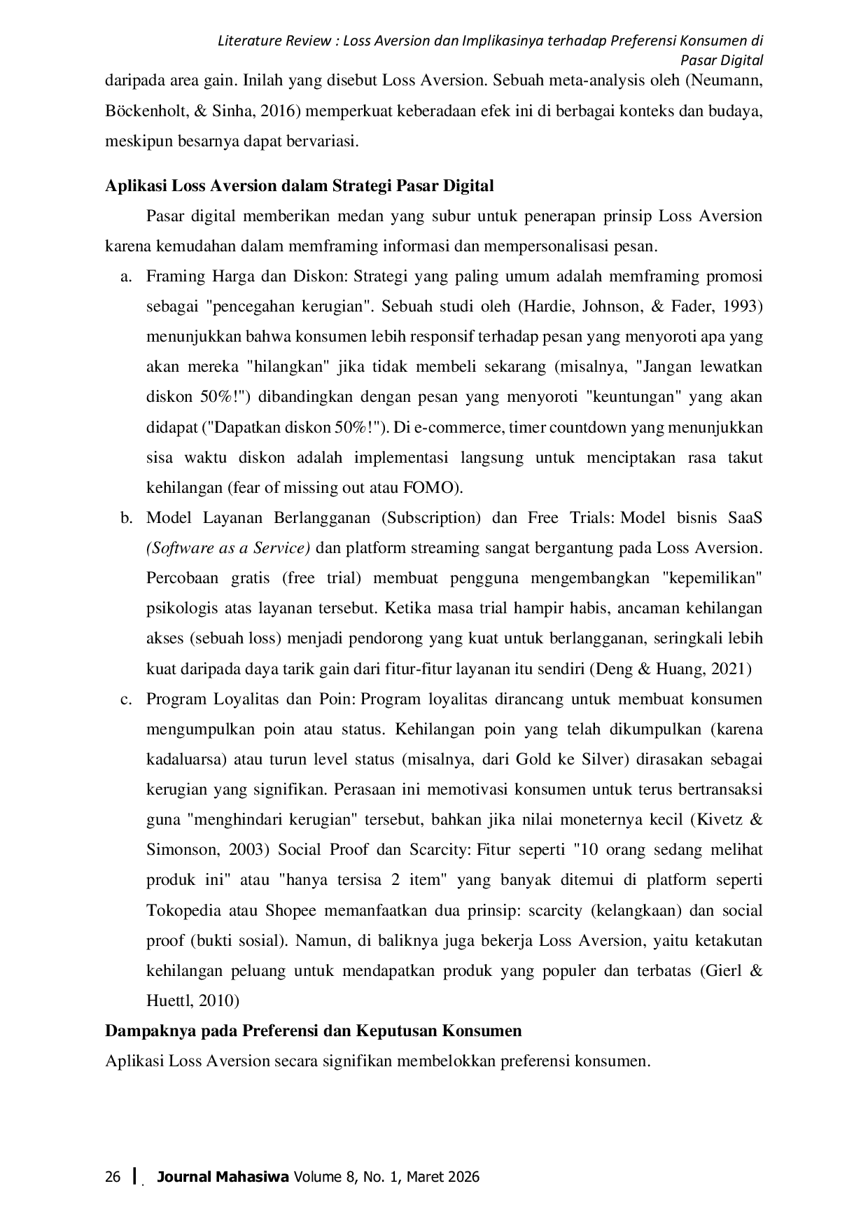 Jurnal Mahasiswa: Jurnal Ilmiah Penalaran dan Penelitian MahasiswaJurnal Mahasiswa: Jurnal Ilmiah Penalaran dan Penelitian MahasiswaThe concept of Loss Aversion, which is central to Prospect Theory, states that individuals feel psychologically greater pain from losses than pleasure from equivalent gains. This paper aims to systematically examine the influence of Loss Aversion on the formation of preferences and consumer decision-making in the context of dynamic digital markets. The method used is a systematic literature review of 30 national and international journals published between 1993 and 2023. The results of the study show that Loss Aversion is widely used by digital businesses through various tactics such as discount framing, free trials, money-back guarantees, limited stock notifications, and loyalty programs. These strategies effectively manipulate perceptions of risk and reward, accelerate the purchasing process, enhance customer retention, and influence brand loyalty. The findings also reveal variations in their impact based on product type, demographics, and culture. This research concludes that a deep understanding of Loss Aversion is not only important for digital marketers to design effective strategies, but also crucial for consumers and regulators to promote more rational and ethical consumer behavior in the digital ecosystem.