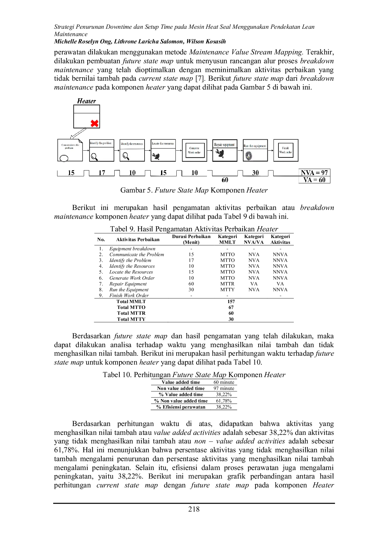 Jurnal Mitra Teknik Industri (JMTI)Jurnal Mitra Teknik Industri (JMTI)Industri manufaktur baterai otomotif menghadapi tantangan dalam efektivitas sistem pemeliharaan mesin, khususnya pada mesin heat seal yang memiliki tingkat downtime tertinggi dengan total waktu 12.722 menit dan frekuensi 434 kali selama April 2024 hingga Maret 2025. Penelitian ini bertujuan untuk mengidentifikasi pemborosan dalam aktivitas breakdown maintenance, menganalisis akar penyebabnya, dan memberikan saran perbaikan berbasis lean maintenance. Metode yang digunakan adalah Maintenance Value Stream Mapping (MVSM) untuk mengidentifikasi aktivitas aktivitas bernilai tambah (VA), tidak bernilai tambah (NVA), dan menghitung efisiensi pemeliharaan berdasarkan indikator MTTO, MTTR, MTTY, dan MMLT. Selain itu, dilakukan analisis akar penyebab menggunakan metode five whys dan pengumpulan data melalui observasi, wawancara, dan Focus Group Discussion (FGD). Hasil penelitian menunjukkan efisiensi perawatan hanya sebesar 32,97% dengan dominasi aktivitas NVA sebesar 67,03%. Pemborosan yang teridentifikasi meliputi waiting, motion, process, dan defect. Usulan perbaikan mencakup penerapan floating technician, penambahan troli, digitalisasi sistem maintenance menggunakan Computerized Maintenance Management System (CMMS), serta penempatan toolbox dan troli peralatan dalam lantai kerja produksi. Penerapan future state map menunjukkan peningkatan efisiensi menjadi 38,22% dan penurunan aktivitas NVA menjadi 61,78%. Hasil ini menunjukkan bahwa pendekatan lean maintenance melalui MVSM efektif dalam mengurangi waste dan meningkatkan keandalan sistem pemeliharaan mesin.