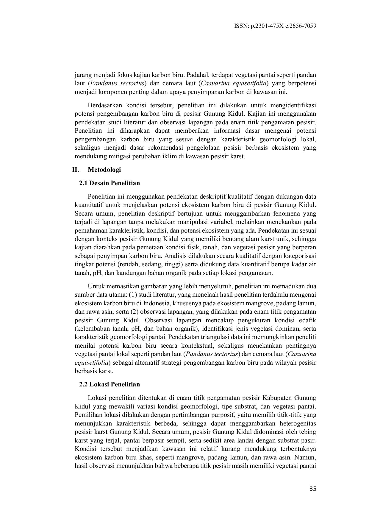 Pelita TeknologiPelita TeknologiBlue carbon refers to carbon stored in coastal and marine ecosystems such as mangroves, seagrass meadows, and salt marshes, which play an important role in climate change mitigation. This study aims to assess the potential for blue carbon development in the coastal area of Gunung Kidul Regency, which is dominated by karst landforms. The methods used include a review of literature related to blue carbon potential in Indonesia and field observations carried out at six coastal sites. The results show that the blue carbon potential in this area is limited due to physical characteristics such as steep karst cliffs and the absence of mangroves, salt marshes, and seagrass ecosystems caused by unsuitable coastal morphology. However, coastal vegetation such as Pandanus tectorius and Casuarina equisetifolia demonstrates relatively high carbon storage capacity and may serve as alternatives for local blue carbon strategies. These findings indicate that blue carbon development efforts in Gunung Kidul should focus on optimizing coastal vegetation adapted to the physical environment. In conclusion, although the limited presence of typical blue carbon ecosystems reduces the regions storage capacity, opportunities still exist through enhancing the role of resilient coastal vegetation as part of ecosystem-based climate mitigation solutions.