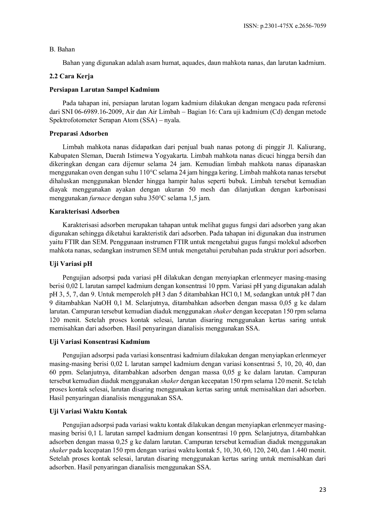 Pelita TeknologiPelita TeknologiKadmium (Cd) merupakan logam berat yang dapat membahayakan ekosistem dan kesehatan manusia bahkan pada konsentrasi rendah. Peningkatan kadar Cd dapat mencemari rantai makanan dan menyebabkan gangguan kesehatan, termasuk kerusakan ginjal. Adsorpsi dianggap sebagai metode penghilangan yang menjanjikan karena kesederhanaan, efisiensi, dan biayanya yang rendah. Penelitian ini menyelidiki potensi mahkota nanas sebagai adsorben alami untuk menghilangkan kadmium dari air. Sistem adsorpsi batch diterapkan menggunakan mahkota nanas tanpa aktivasi dengan variasi pH, konsentrasi kadmium, dan waktu kontak untuk menentukan kondisi optimal. Asam humat juga ditambahkan pada konsentrasi yang berbeda untuk mengevaluasi pengaruhnya terhadap kinerja adsorpsi. Adsorben dikarakterisasi menggunakan FTIR dan SEM, sementara kadar kadmium dianalisis menggunakan Spektrofotometri Serapan Atom (SSA). Hasil penelitian menunjukkan bahwa adsorpsi optimal terjadi pada pH 7, konsentrasi Cd 10 ppm, dan waktu kontak 120 menit. Proses adsorpsi mengikuti isoterm Langmuir dan model kinetika orde kedua. Penambahan asam humat menunjukkan respons optimal pada 5%, tetapi pengaruhnya tidak signifikan. Efisiensi penghilangan maksimum mencapai 88,77%, menunjukkan bahwa mahkota nanas adalah adsorben yang efektif dan berkelanjutan untuk penghilangan Cd.