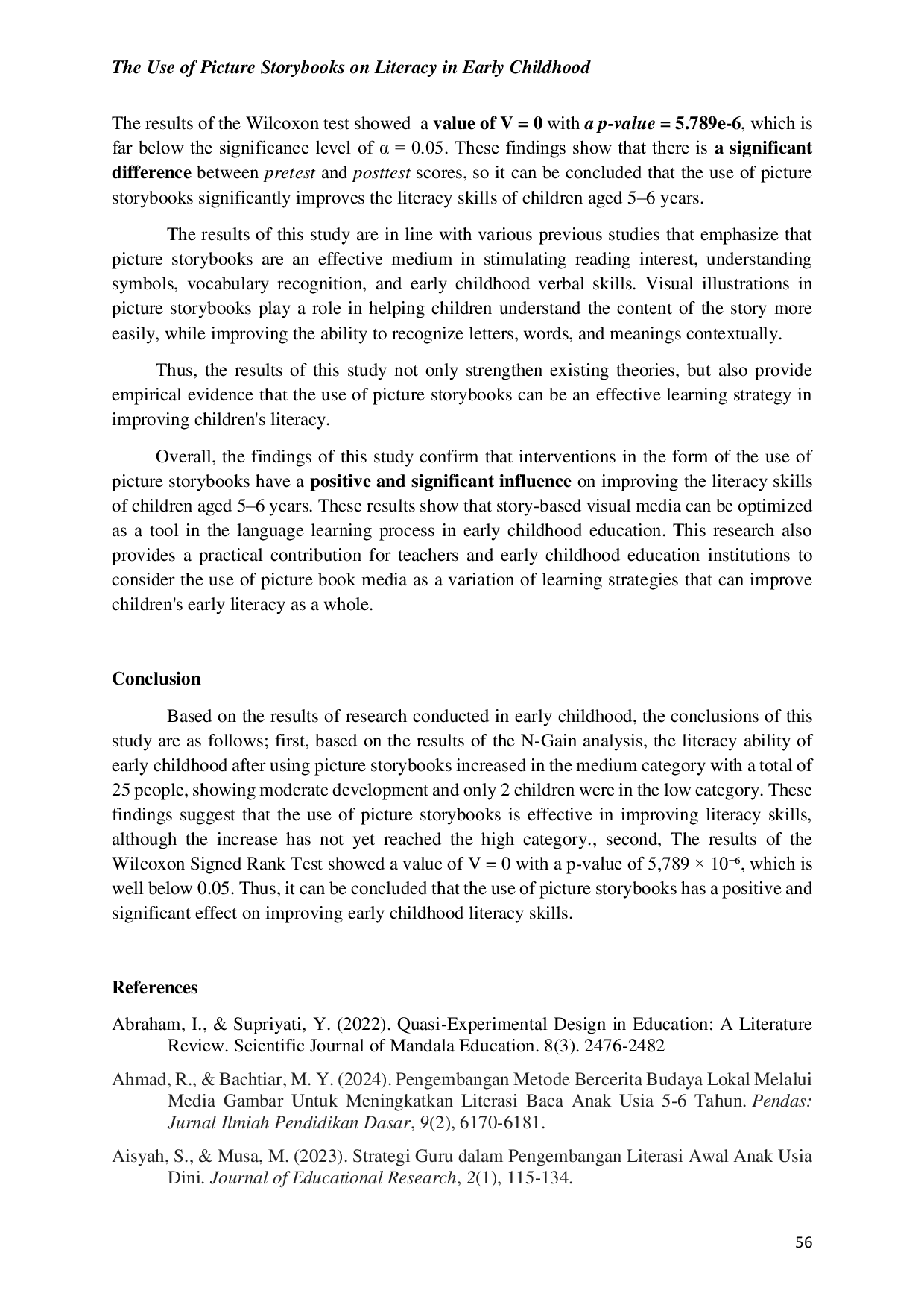 Berdasarkan hasil penelitian yang dilakukan pada anak usia dini, dapat disimpulkan bahwa penggunaan buku cerita bergambar memiliki pengaruh positif dan signifikan terhadap peningkatan keterampilan literasi.Hasil analisis N-Gain menunjukkan bahwa kemampuan literasi anak usia dini meningkat pada kategori sedang, dengan hanya 2 anak berada pada kategori rendah.Temuan ini menunjukkan bahwa penggunaan buku cerita bergambar efektif dalam meningkatkan keterampilan literasi, meskipun peningkatan belum mencapai kategori tinggi.Uji Wilcoxon Signed Rank menunjukkan adanya perbedaan yang signifikan antara skor pra-tes dan pascates, sehingga dapat disimpulkan bahwa penggunaan buku cerita bergambar meningkatkan keterampilan literasi anak usia dini.Secara keseluruhan, penelitian ini memperkuat teori yang ada dan memberikan bukti empiris bahwa penggunaan buku cerita bergambar dapat menjadi strategi pembelajaran yang efektif dalam meningkatkan literasi pada anak usia dini.